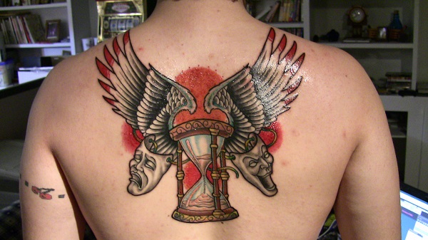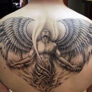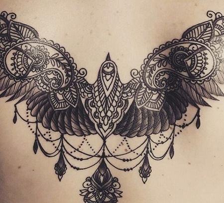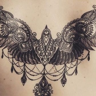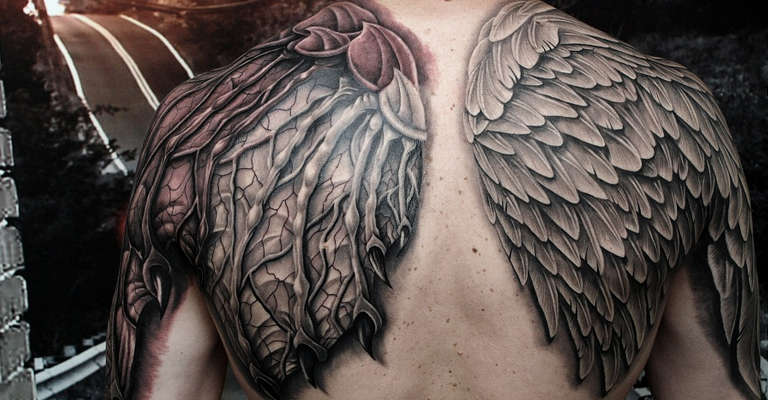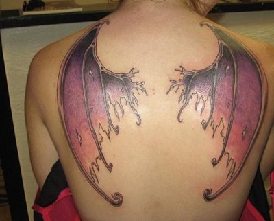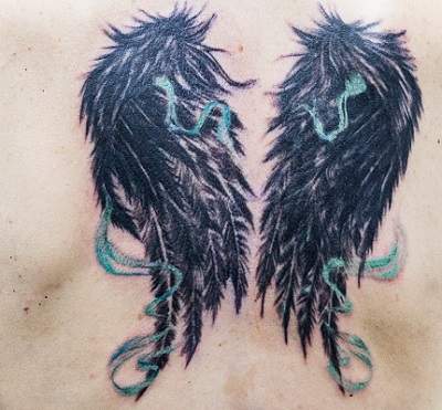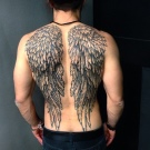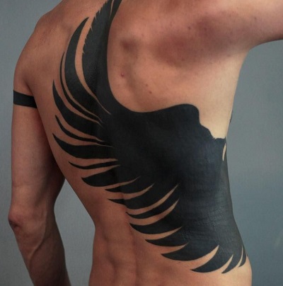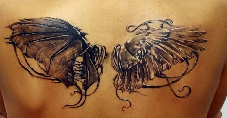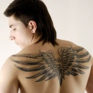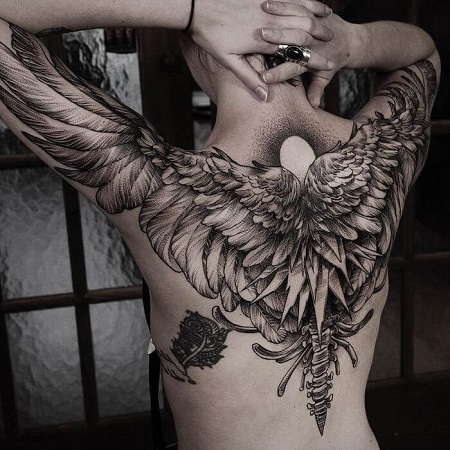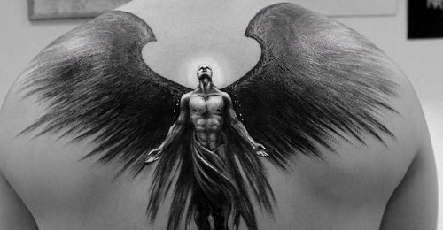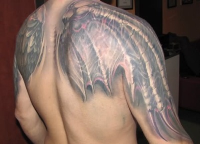 - Aspetto molto interessante e insolito tatuaggi, in cui viene disegnata una sagoma di una colonna vertebrale umana tra le ampie ali.