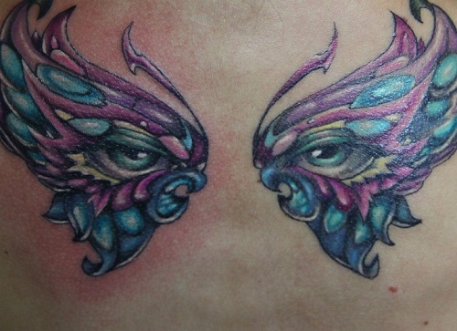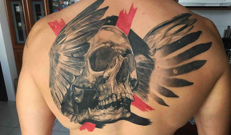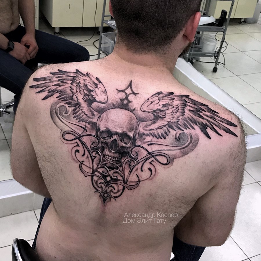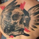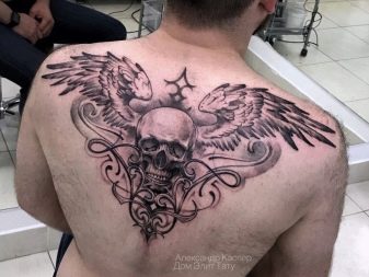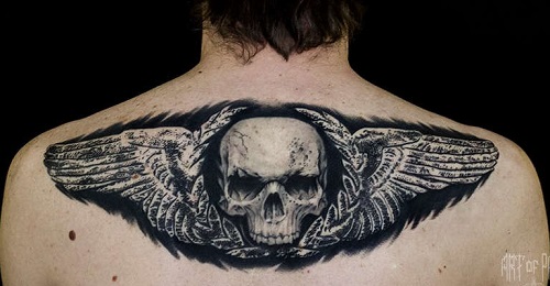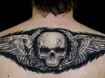 - La composizione può essere completata da un'immagine di un teschio, anch'essa disegnata nello spazio tra le ali o chiaramente di fronte a loro. Tali tatuaggi non simboleggiano sempre qualcosa di brutto e negativo. Persone diverse attribuiscono significati diversi a questo elemento sui loro corpi.
