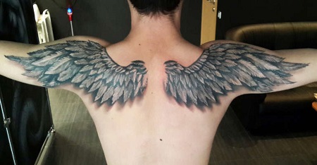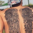 Il tatuaggio di questo uomo è uno dei più popolari. In esso, splendide ali d'angelo sono sparse sulle scapole, il che sembra molto impressionante e affascinante. I tatuaggi realizzati con uno spirito simile fungono da simboli della natura amante della libertà di una persona, la sua fede in un angelo custode. Le ali d'angelo sono spesso posizionate non solo sul retro, ma anche sul petto.