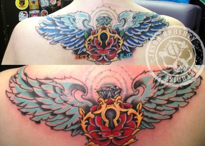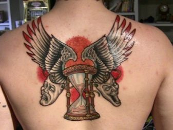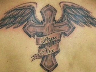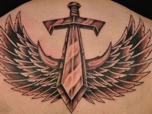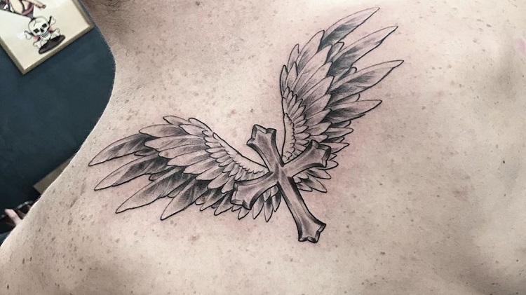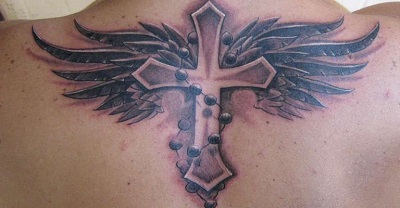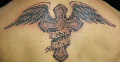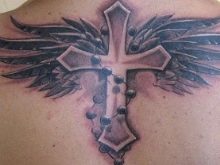 Non è raro che gli uomini decorino la schiena con un tatuaggio con ali e una croce. Di solito questo motivo ha una connotazione religiosa, simboleggia il ricordo di una persona su Gesù, la sua sofferenza e morte. Inoltre, molti uomini, a causa di un tale tatuaggio, esprimono riverenza e rispetto per una persona deceduta vicina. Le prestazioni di progettazione del disegno possono variare. La croce porta spesso il nome o la data di morte di un amico/parente.
