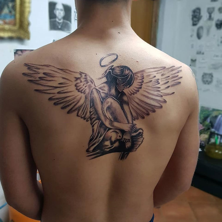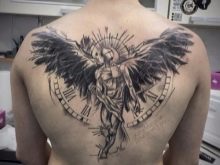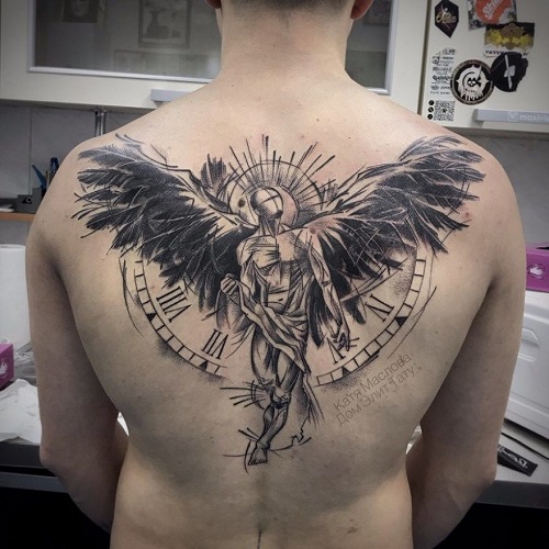 - L'immagine di un angelo seduto o che vola su ali larghe è un motivo molto popolare per il tatuaggio di un uomo.... Tali composizioni sono farcite sia in bianco e nero che in versioni multicolori.
