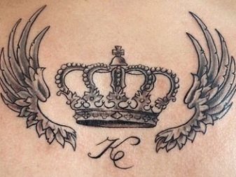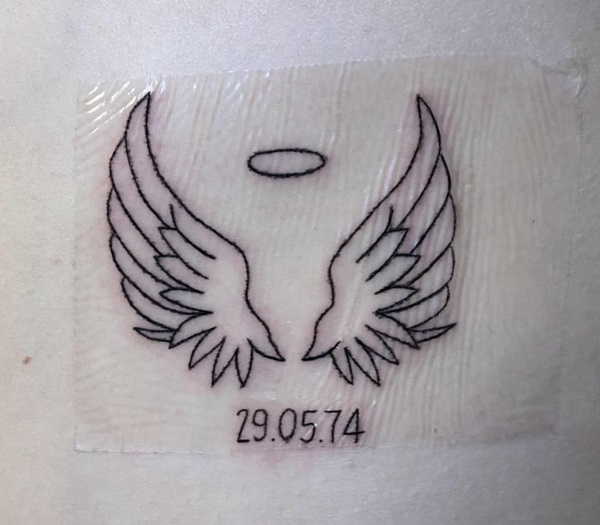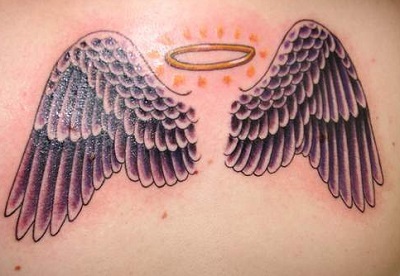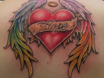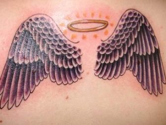 C'è un'altra variante del tatuaggio raffigurante le ali: ha un dettaglio aggiuntivo sotto forma di un'aureola. Di norma, questo tatuaggio funge da simbolo di una persona deceduta. Tali disegni sono molto significativi per gli uomini. In molti casi, il tipo di tatuaggio in questione è integrato non solo con un alone, ma anche con le iniziali o il nome della persona interessata. Le soluzioni di colore in questi disegni possono essere molto diverse: dal bianco e nero al multicolore.