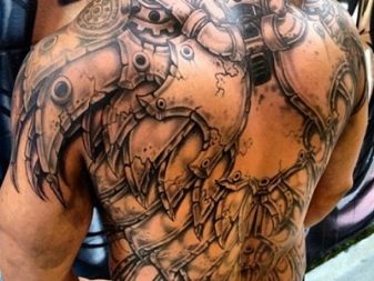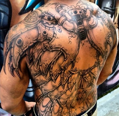 - Biomeccanica... I tatuaggi a forma di ali creati in questo stile sembrano molto insoliti e impressionanti sulla schiena degli uomini. La biomeccanica consente di utilizzare quasi tutte le tavolozze di colori e sfumature, prevede schizzi su larga scala, la presenza di molti piccoli dettagli.