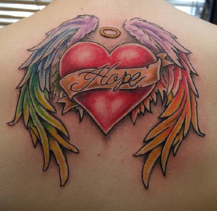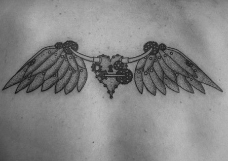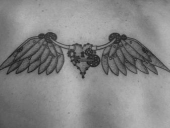 I tatuaggi a forma di ali, integrati dall'immagine di un cuore, sembrano originali e luminosi. L'ultimo elemento è un simbolo di amore. Questo suggerisce che un uomo si sente facile e libero in una relazione.