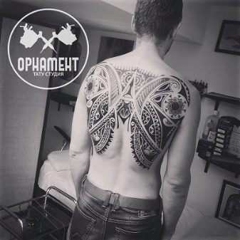 - Ornamentale... Le ali insolite e molto belle sulla schiena di un uomo possono essere realizzate in stile ornamentale. Tali immagini assomigliano a modelli intricati e intricati. Di solito tali tatuaggi hanno un significato profondo nascosto. Alcune persone credono che i tatuaggi ornamentali siano i migliori amuleti.