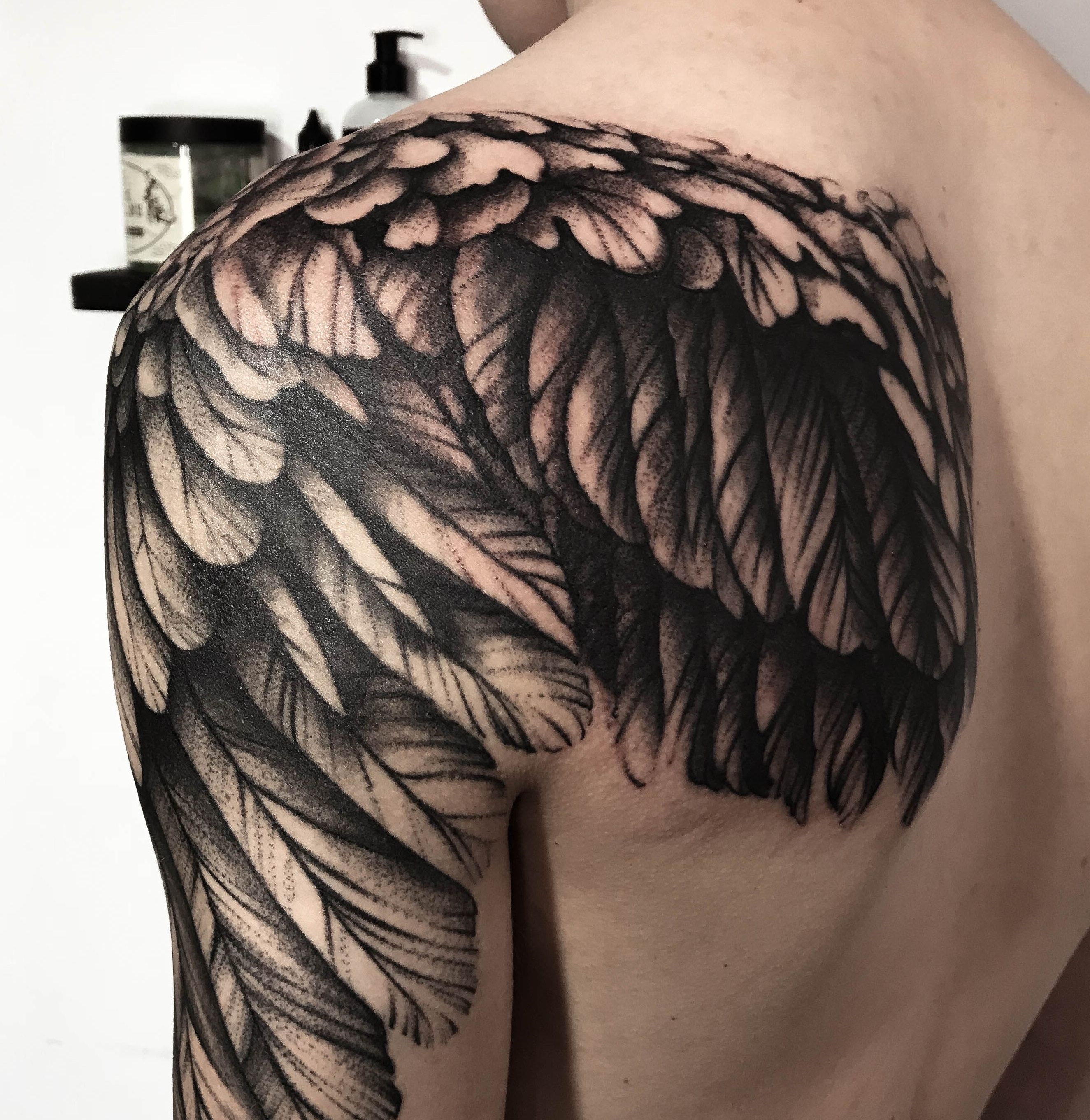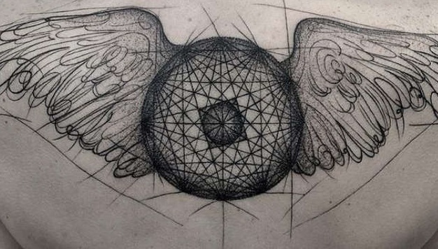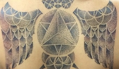 - Dotwork... Questo stile è molto popolare al giorno d'oggi. La patria del dotwork è l'Inghilterra.La direzione è molto insolita, quindi è difficile confonderla con altri stili di tatuaggio. Le composizioni Dotwork sono disponibili solo per artisti di grande esperienza e talento. Un tatuaggio a forma di ali, progettato in uno stile simile, si rivelerà il più efficace possibile, ma molto difficile da implementare.