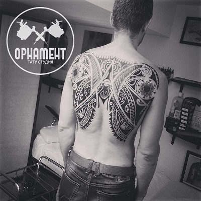 - Blackwork... Stili particolarmente apprezzati dagli uomini. I tatuaggi, che sono realizzati secondo questa direzione, sono prevalentemente di colore nero. È accettabile la presenza di piccole macchie bianche o rosse. Lo stile è appropriato per quasi tutte le parti del corpo, compresa la schiena.