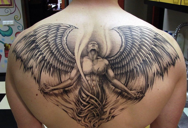 Facciamo conoscenza con le principali varietà e schizzi di tatuaggi maschili sotto forma di ali sul retro.