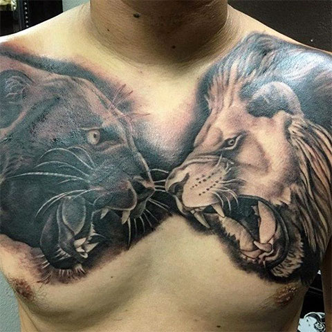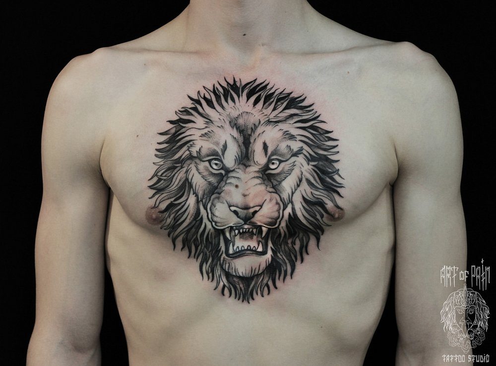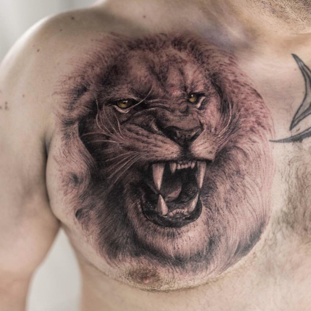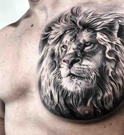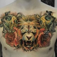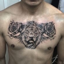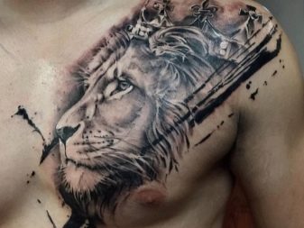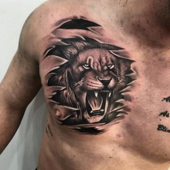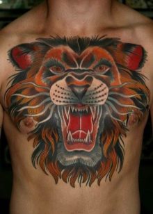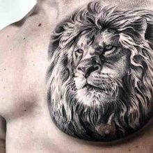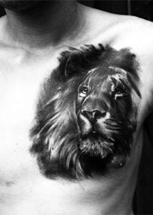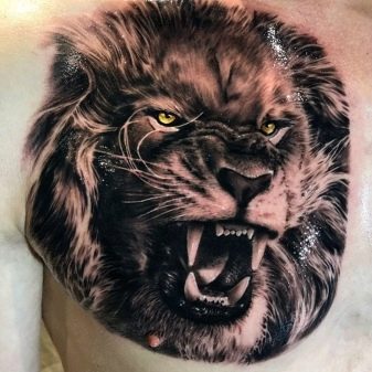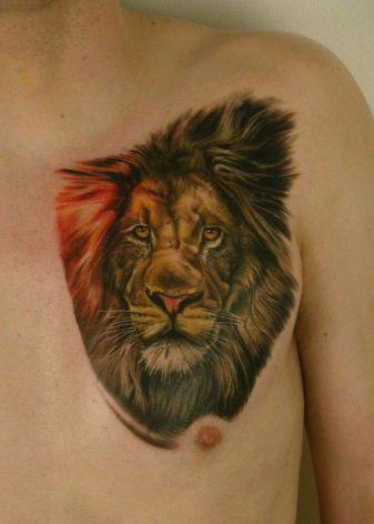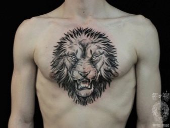 Il leone è uno degli animali più nobili e regali. Questo è un simbolo puramente maschile che i rappresentanti del sesso più forte scelgono spesso per i loro tatuaggi. Il leoncino, di regola, non è raffigurato, più spesso vengono scelte immagini grandi e voluminose. E per questo, l'area dello sterno è la più adatta.