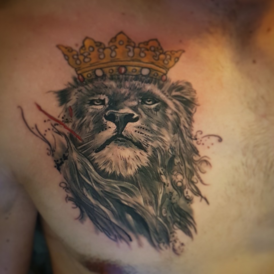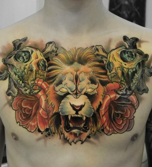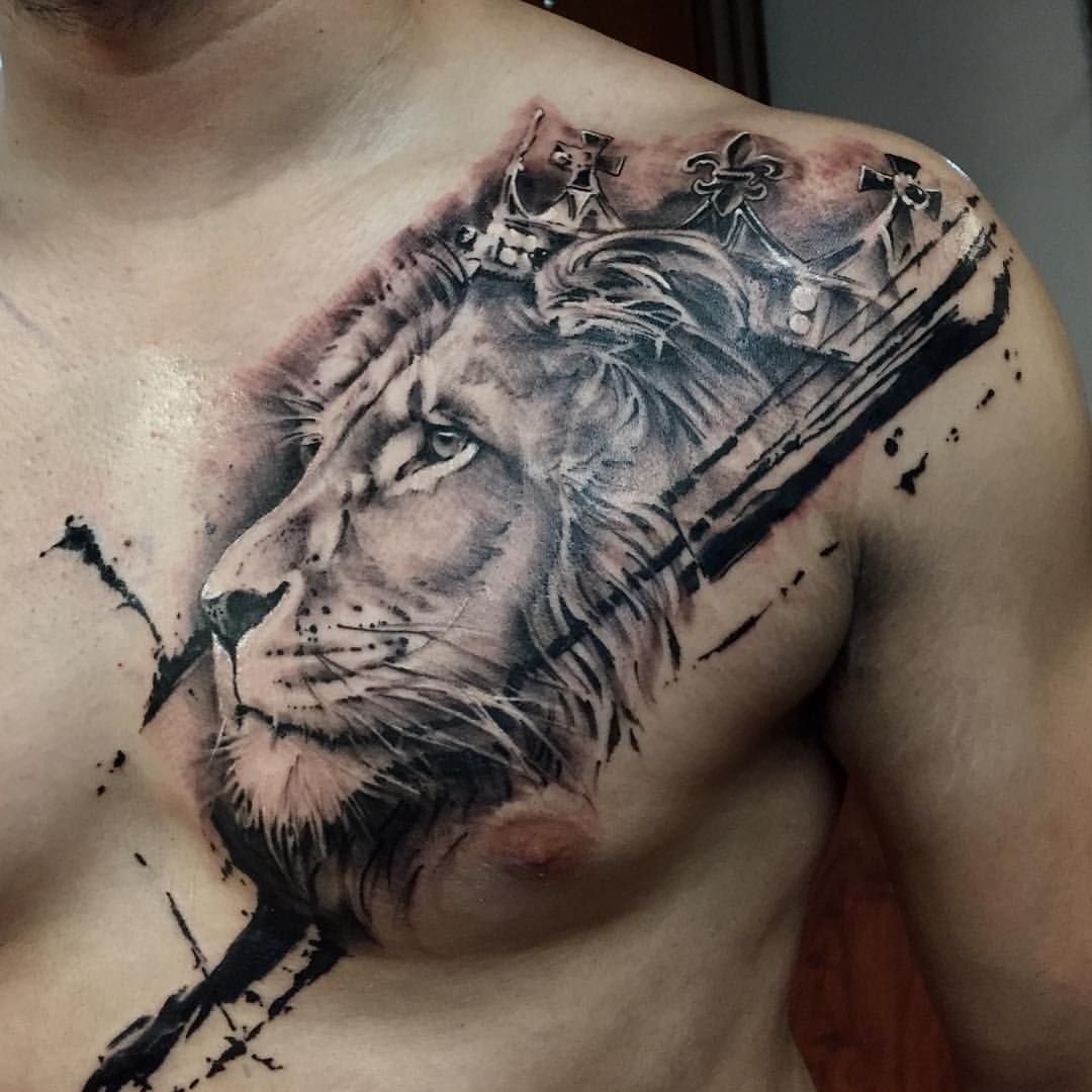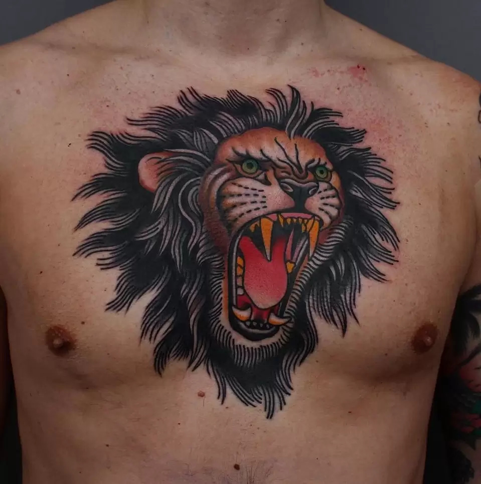 Il leone è uno degli animali più nobili e regali. Questo è un simbolo puramente maschile che i rappresentanti del sesso più forte scelgono spesso per i loro tatuaggi. Il leoncino, di regola, non è raffigurato, più spesso vengono scelte immagini grandi e voluminose. E per questo, l'area dello sterno è la più adatta.