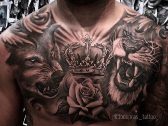 Anche gli schizzi per i tatuaggi possono essere diversi. Ad esempio, a molti uomini piacciono i leoni coronati. Potrebbe essere un po' stereotipato, ma sembra comunque impressionante. Inoltre, non è necessario raffigurare il classico volto della bestia, incoronato da una corona. Puoi ottenere un tatuaggio in stile inglese, dove sono raffigurati diversi leoni in piena crescita e una corona tra di loro. Tali disegni sono spesso integrati con rose.