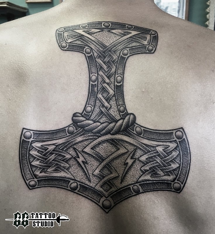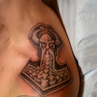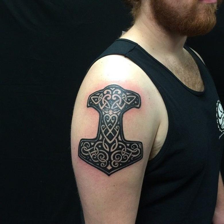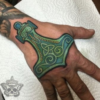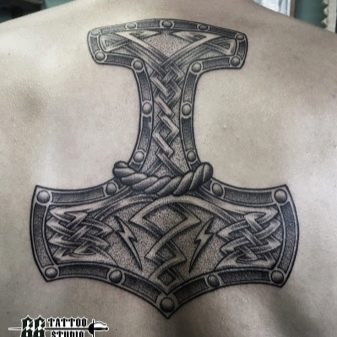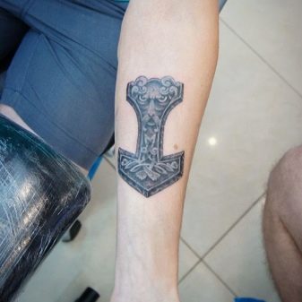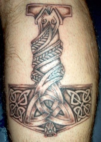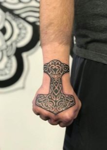 Quindi, molto spesso viene applicato Mjolnir come immagine indipendente, che non è integrato da elementi compositivi. Un gusto per un tale modello è dato da una varietà di motivi decorati che adornano il martello, possono essere molto diversi. Spesso, un tale martello è decorato con disegni di vari amuleti, che esaltano il significato di un tale tatuaggio come un talismano. Di norma, tali disegni sono realizzati in bianco e nero.