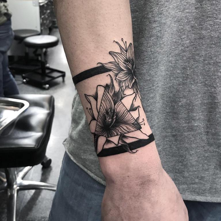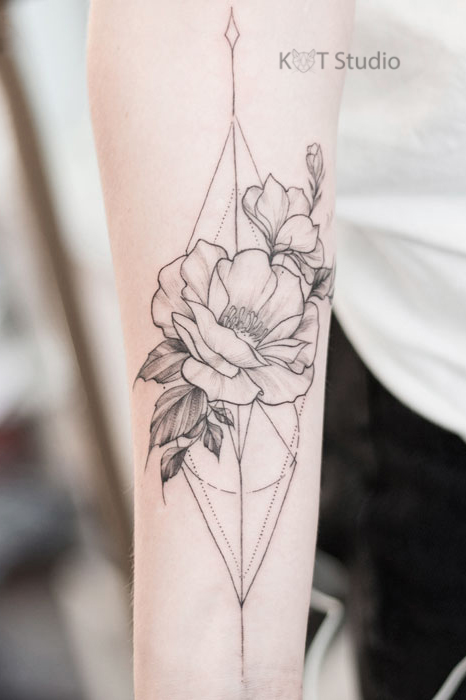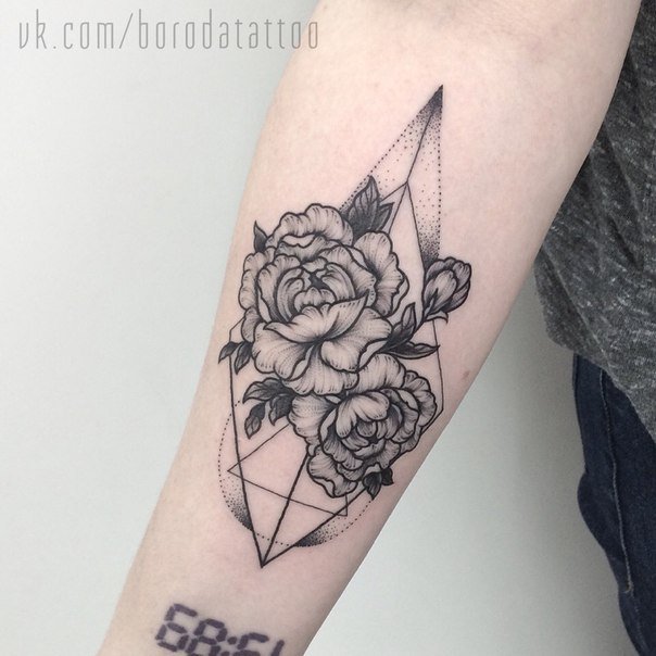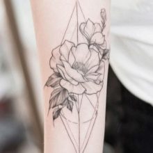 - Fiori e piante. Questa opzione è anche più preferita dal gentil sesso, ma molti schizzi possono essere adatti anche agli uomini. Le immagini geometriche con loto, rosa e sakura sono spettacolari. I fiori sono completati da disegni sotto forma di triangoli, cerchi, quadrati anche monocromatici.