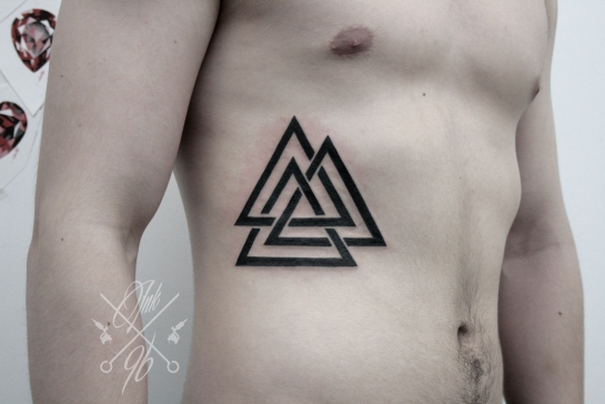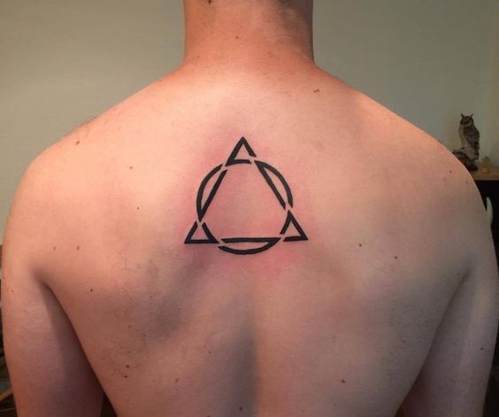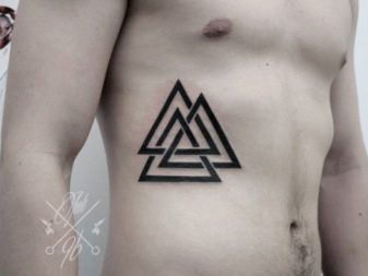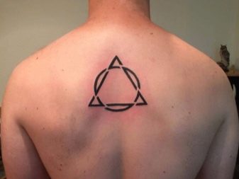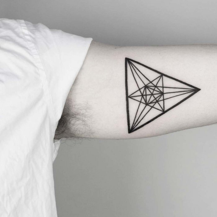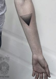 Un tatuaggio a forma di triangolo ha un significato profondo e un significato sacro. La figura geometrica riflette l'indivisibilità di tre componenti: anima, mente e corpo. A volte la figura rappresenta ciclicità: nascita, vita e morte.