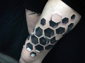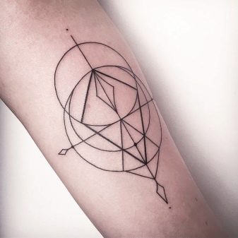 Spesso, i disegni sotto forma di semplici forme geometriche sono imbottiti su varie parti del corpo, molto spesso raffigurano una palla, un quadrato. La prima opzione simboleggia l'universo, la globalità, il pianeta. La palla era considerata un riflesso dell'eternità, un mondo senza guerre. La seconda opzione simboleggia l'ordine, la stabilità e la stabilità.