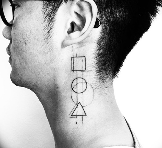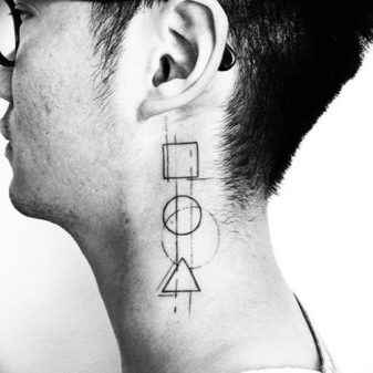 Un luogo adatto è considerato e collo... Su questa parte del corpo, puoi raffigurare un piccolo tatuaggio geometrico. Si può realizzare sia in bianco e nero che a colori. A volte fanno una transizione spettacolare dal collo alla schiena, che si traduce in un ampio modello del corpo.