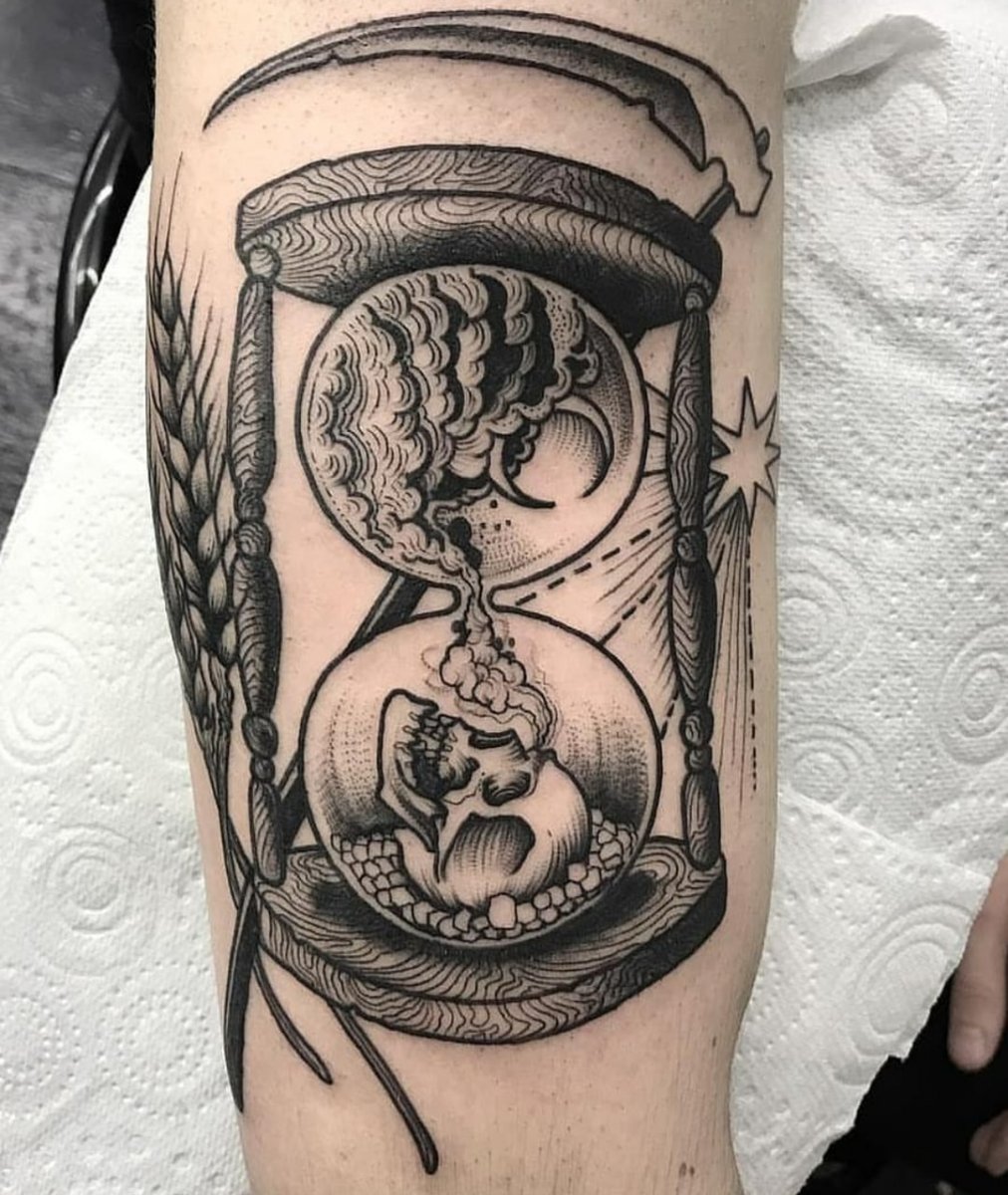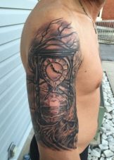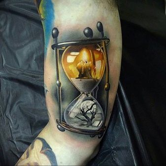 - L'immagine della clessidra indicherà che il proprietario del tatuaggio apprezza il tempo., perché è fugace, e minuti preziosi non vanno sprecati in sciocchezze. Ma se le particelle di quarzo in un tale orologio vengono sostituite da gocce di sangue nel disegno, allora in questo caso il tatuaggio assume un significato diverso, indicando che la vita è spesso piena di orrori.