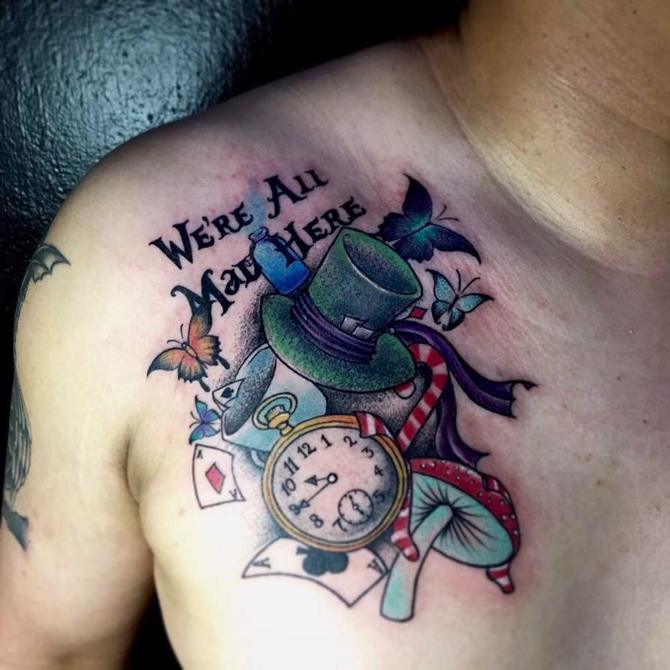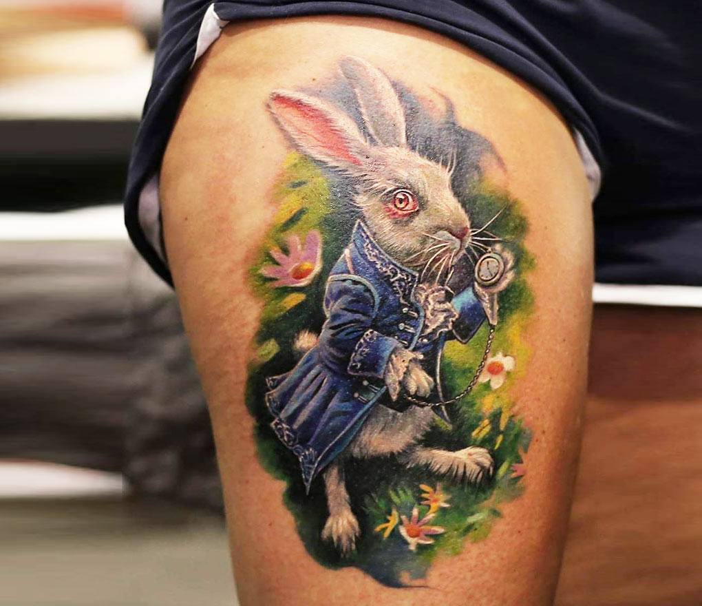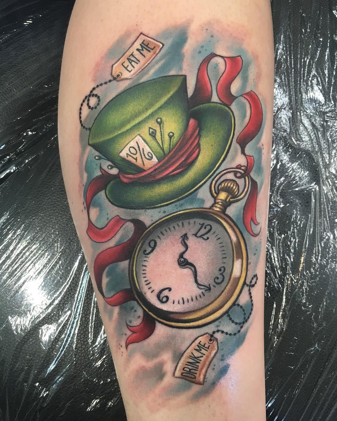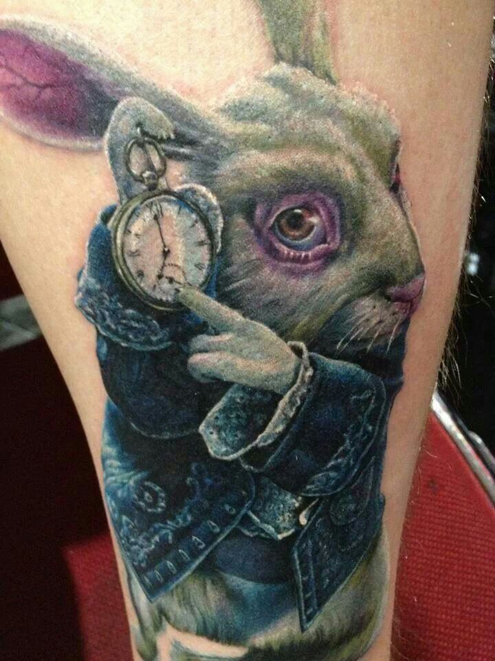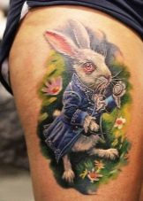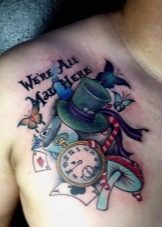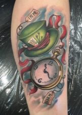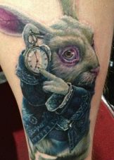 - Orologio dalla famosa opera "Alice nel paese delle meraviglie" sono spesso applicati anche come tatuaggio. Spesso un tale orologio è raffigurato in combinazione con il Bianconiglio, che, secondo la trama, era sempre in ritardo, dando un'occhiata al momento. Un tale disegno indicherà che la persona che è il suo portatore è costantemente di fretta da qualche parte, non ha abbastanza tempo e cerca di catturare tutto.