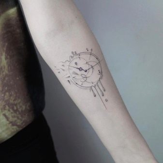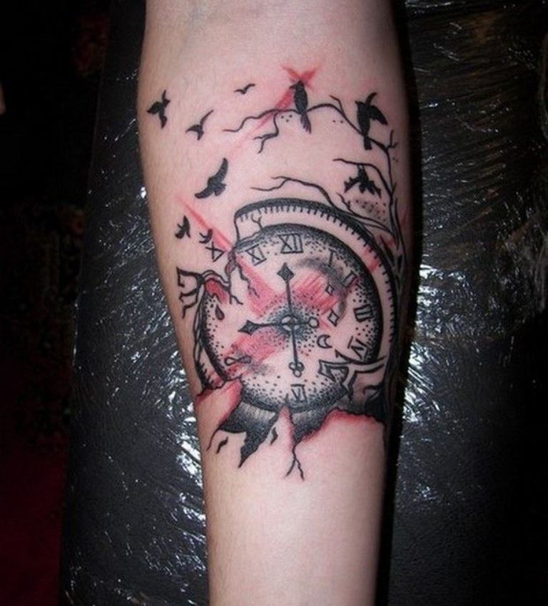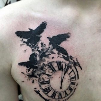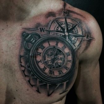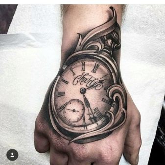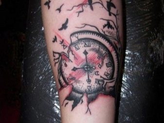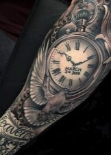 - Quindi, se non ci sono le mani sul tatuaggio dell'orologio sul quadrante, quindi questo suggerisce che il proprietario dell'immagine ha perso il significato della vita. Secondo l'opinione di una tale persona, la sua esistenza è vuota e senza valore. Ma se le frecce sono presenti, allora, di regola, indicano un momento significativo nella vita di chi indossa il tatuaggio. Spesso tali disegni possono essere integrati con iscrizioni, ad esempio il nome del bambino, se il disegno è stato realizzato in onore della sua nascita.