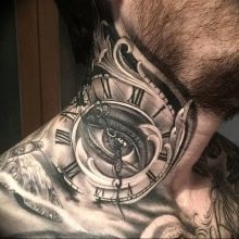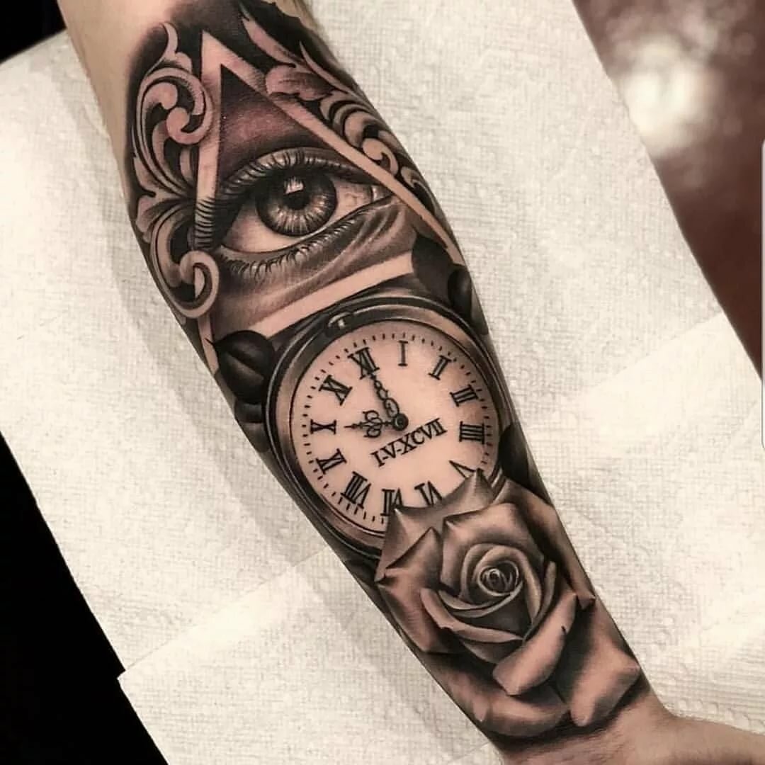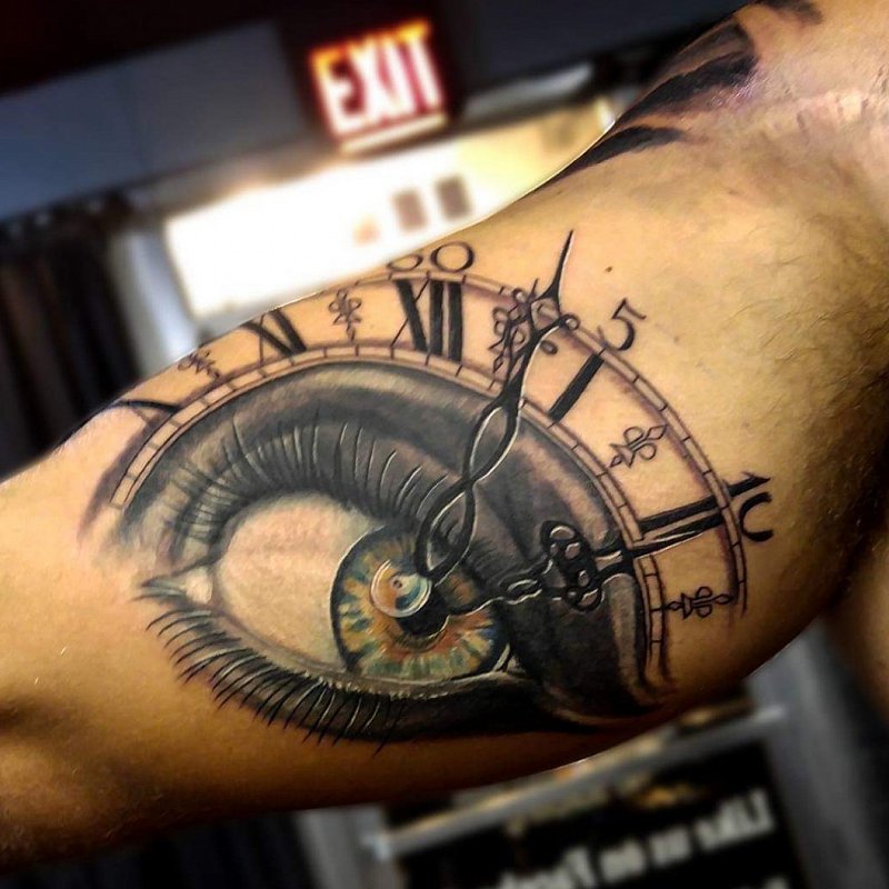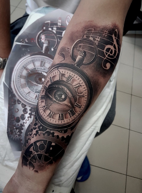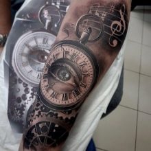 - Spesso su tali tatuaggi, puoi vedere un occhio aperto., che si trova proprio al centro del quadrante. Il significato di un tale disegno è molto interessante, perché dirà che il tempo non è una sostanza fluida, ma una vera personalità stessa. Inoltre, l'occhio è spesso visto come la personificazione di Dio, che osserva una persona e come trascorre preziosi minuti della sua vita.