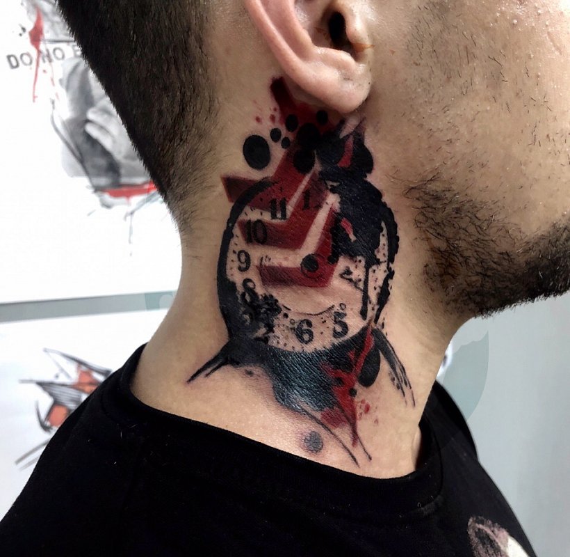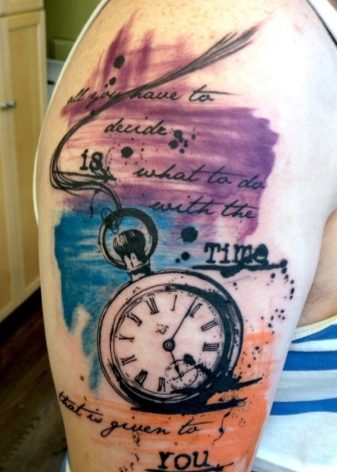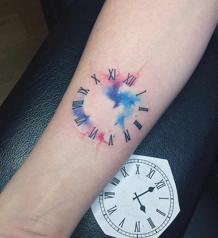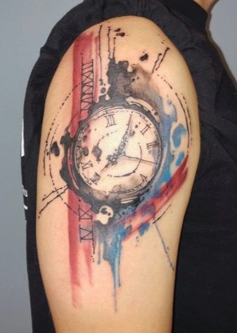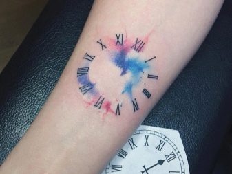 Anche le immagini degli orologi realizzati in stile acquerello sembrano molto interessanti. Tali tatuaggi si distinguono per la loro luminosità e bellezza. Di solito non hanno contorni chiari, a causa delle peculiarità di questo stile, e il disegno stesso sembra dipinto con veri acquerelli.