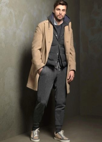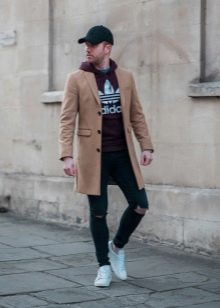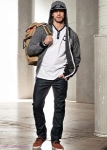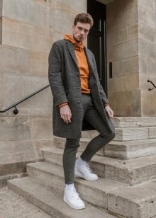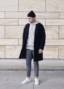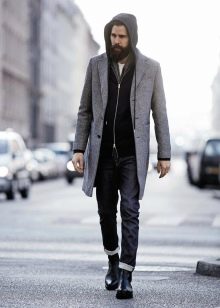 - Fiocco casual autunnale. Questo look è basato su una felpa con cappuccio. L'ensemble è abbinato a jeans dritti scuri. E come capospalla, viene selezionato un cappotto grigio (indossato completamente aperto). Una maglietta viene solitamente indossata sotto il fondo dello strato caldo. Stivaletti Chelsea e una sciarpa in maglia completano il look.