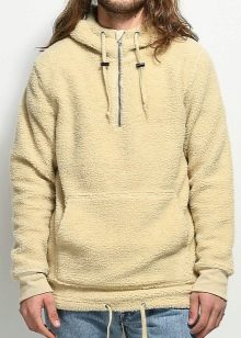 In molte felpe da uomo la cerniera è assente, come qualsiasi altro tipo di chiusura. I vestiti sono fissati con cravatte o lacci aggiuntivi, a seconda del modello. Inoltre, quasi tutti i modelli hanno maniche lunghe, anche se ci sono già modelli senza maniche più stravaganti.Inoltre, il modello è dotato di tasche applicate, cappuccio, ha un arredamento interessante o è composto da trame e colori combinati.