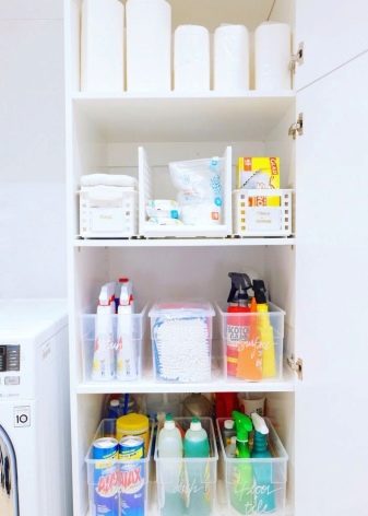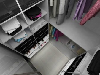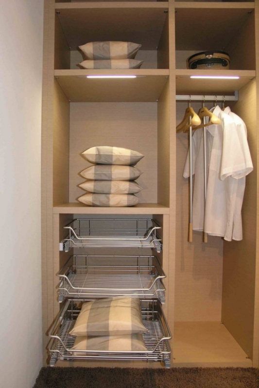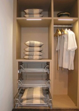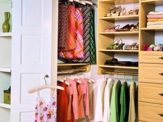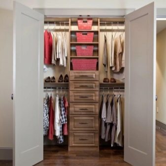 Il est facile d'équiper un dressing dans le garde-manger si vous créez un système de rangement pratique. Pour cela, l'espace intérieur de la pièce est distribué dans une commande spéciale. Ainsi, pour les petites choses, vous devez allouer des étagères ou des boîtes séparées. La meilleure option pour le stockage est soignée, s'il y a les deux.