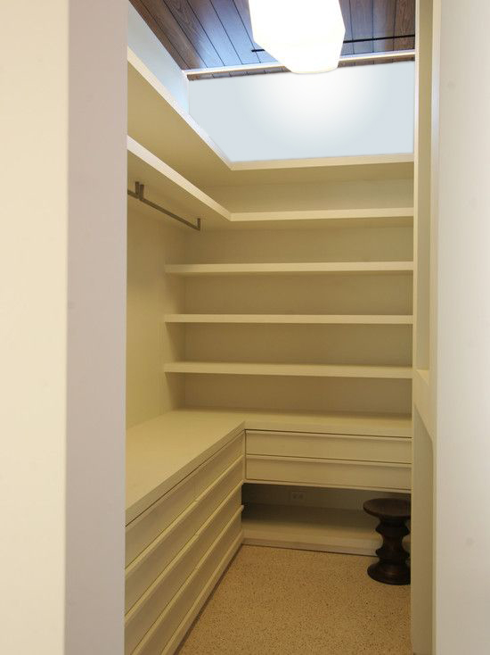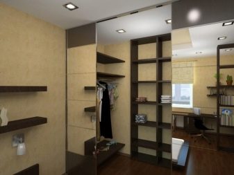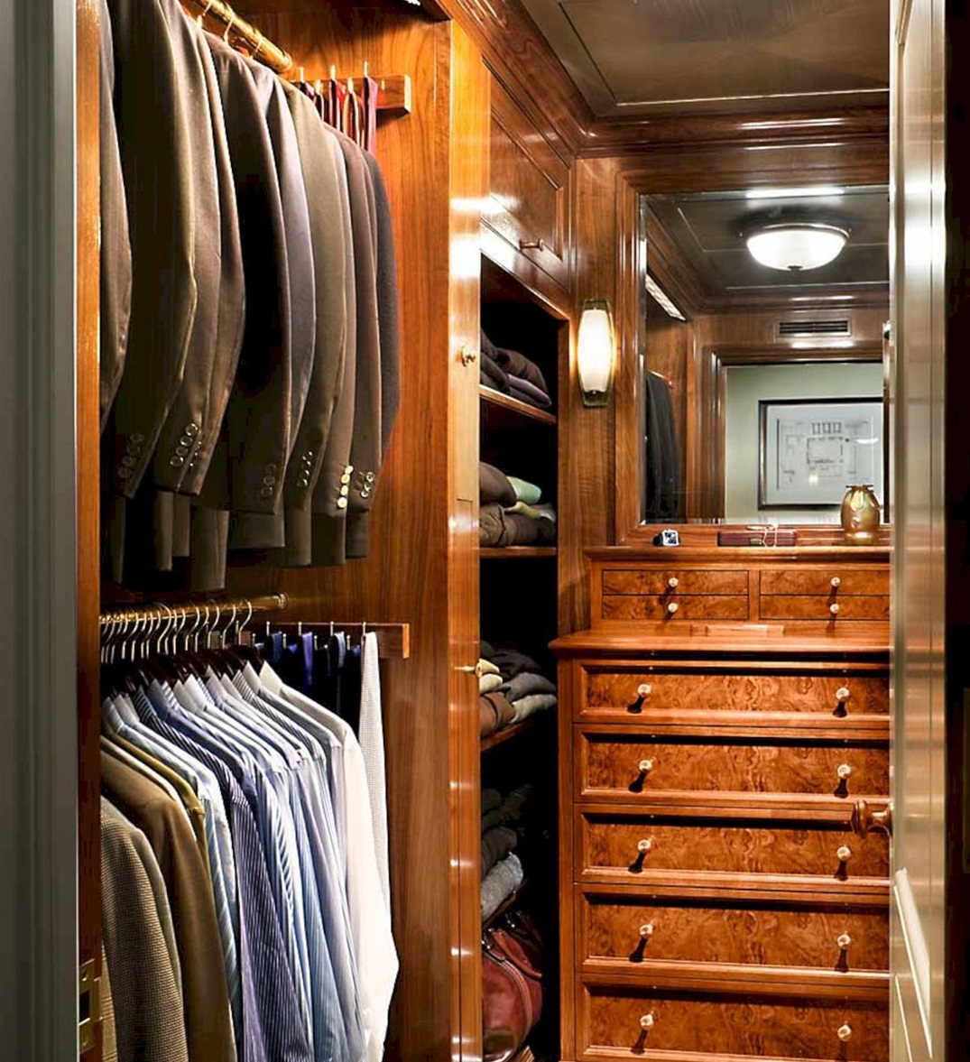 Dans une garçonnière, un garde-manger peut facilement être converti en un dressing pratique. La commode intégrée en devient l'élément central. L'intérieur élégant est décoré de grain de bois. Pour donner au dressing un aspect fini, vous pouvez ajouter un miroir et quelques types de lampes.