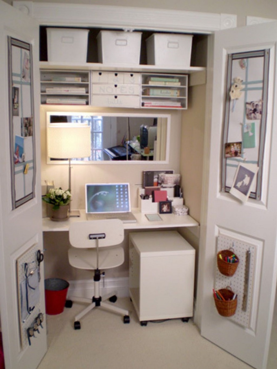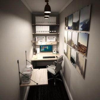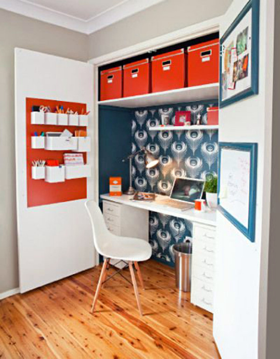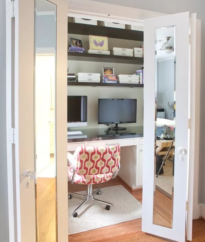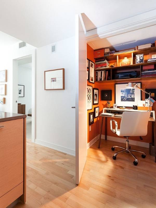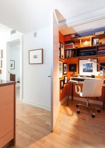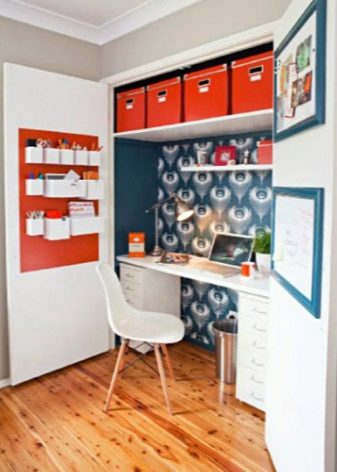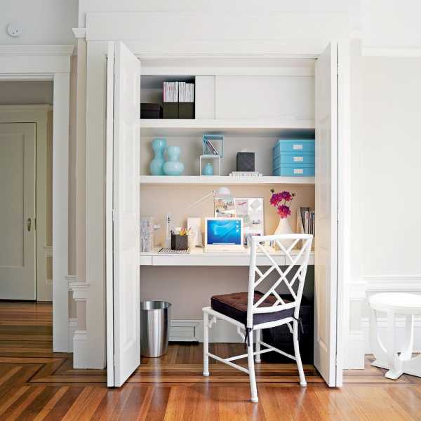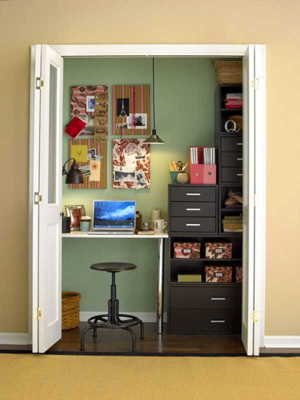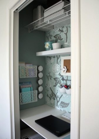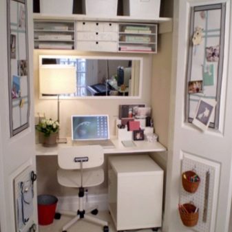 Un mini-bureau dans le placard deviendra une solution indispensable pour ceux qui travaillent à domicile. Finitions économiques, éclairage adéquat et mobilier confortable. Cela suffit pour rendre le lieu de travail confortable.