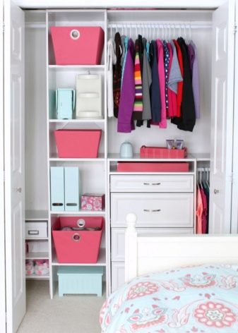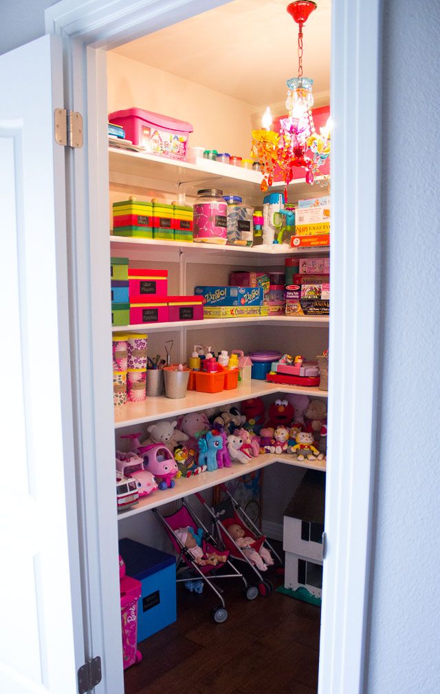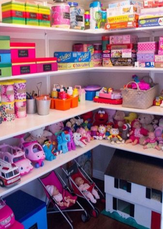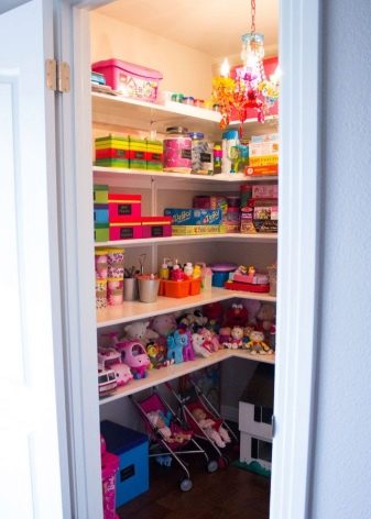 Dans le garde-manger à côté de la crèche, il est bon, par exemple, de créer une pièce entière pour une petite princesse. La couleur rose vif créera la bonne atmosphère. L'abondance d'étagères et de supports pour cintres créera un ordre parfait. La place centrale dans cet espace lumineux doit être donnée, bien entendu, aux jouets.