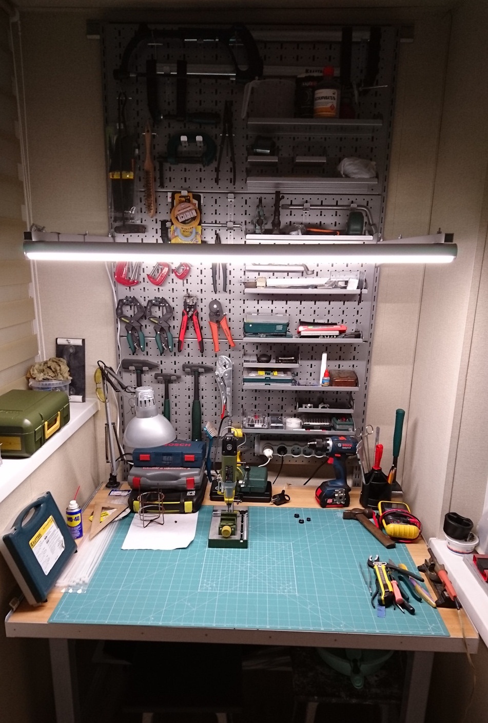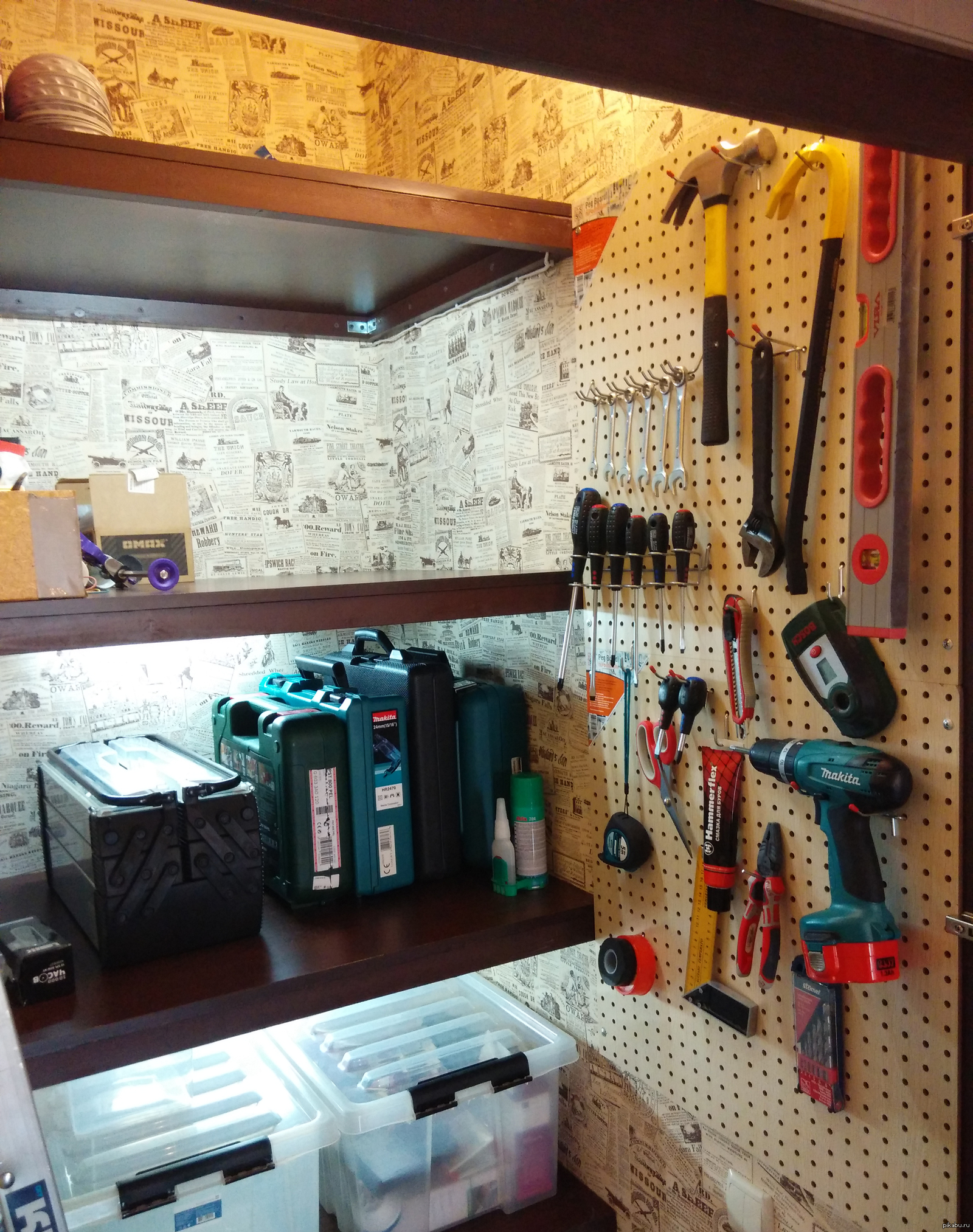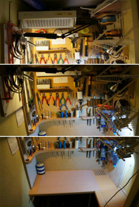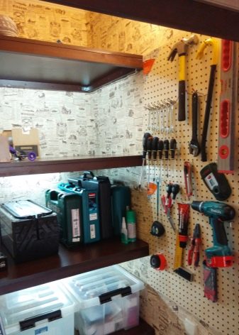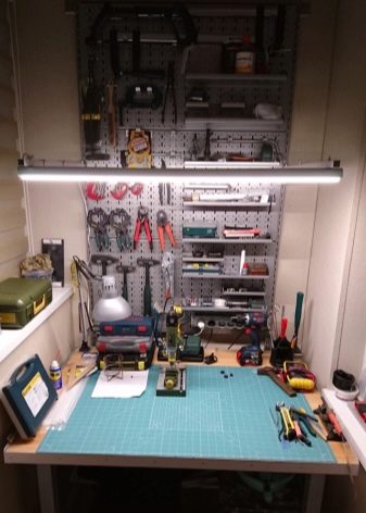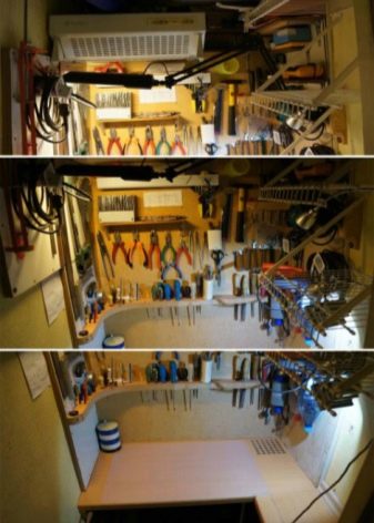 Décorer un espace de travail d'atelier dans un placard est une excellente idée. Pour ce faire, vous devrez aménager un endroit pour ranger les outils sur les murs. C'est très pratique lorsque les tournevis, clés, limes et scies à métaux sont facilement accessibles avec la main. En effet, il faut parfois un outil rapidement, mais il est difficile de le chercher dans une boîte. Vous pouvez également occuper une partie de la pièce avec des étagères qui accueilleront des appareils plus volumineux ou des pièces détachées.