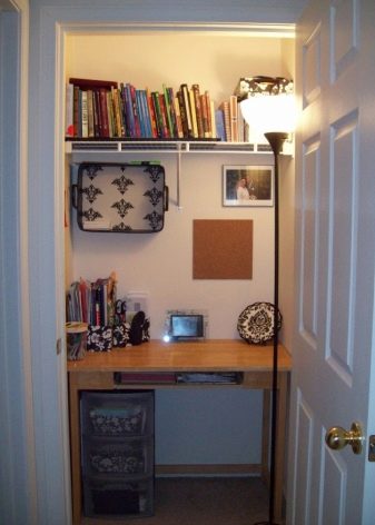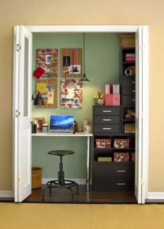 - En version 1 pièce, qui se caractérisent par une petite surface, vous devrez peser soigneusement les choses pour lesquelles vous avez besoin d'un garde-manger. Bien sûr, dans les maisons à panneaux modernes, plus d'espace peut être alloué à un entrepôt. Cependant, ici, il est également important qu'ils s'en débarrassent correctement. À "Khrouchtchev", où vivent deux ou trois personnes, le placard peut être transformé en un mini-bureau élégant et confortable pour travailler avec du matériel de bureau.
