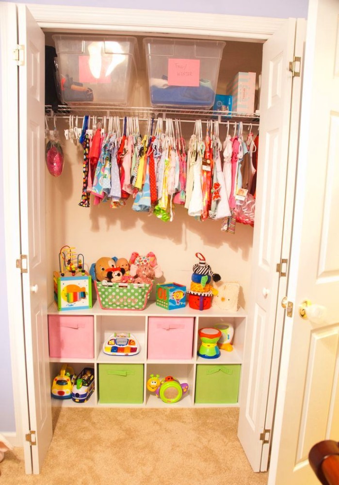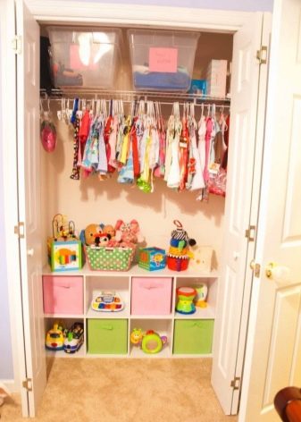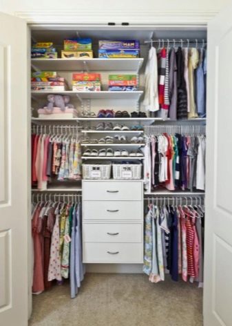 Si la chambre des enfants jouxte l'espace garde-manger, elle peut être transformée en un espace de rangement pour les objets et les jouets des enfants. Dans ce cas, des couleurs vives doivent être utilisées pour la décoration. En ce qui concerne l'équipement, vous pouvez choisir l'option pour le dressing - avec des étagères, des cintres et des tiroirs.