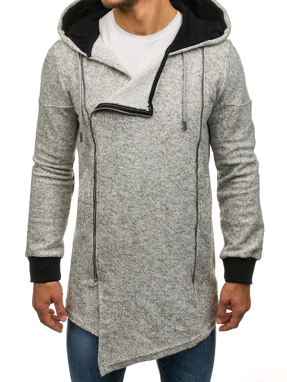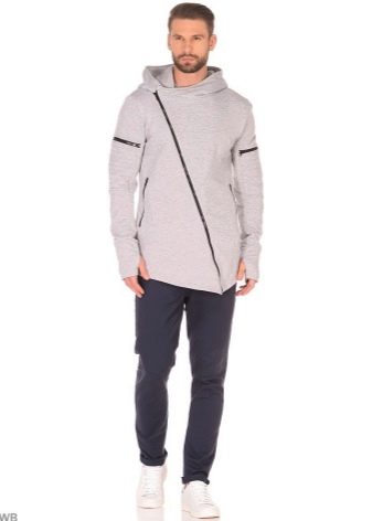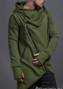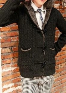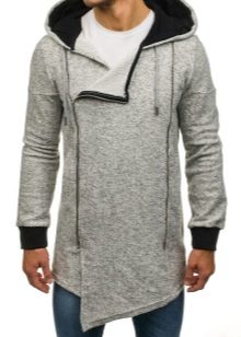 - Avec fermoir asymétrique. Les cardigans à capuche de ce style ressemblent un peu à une veste de motard. Le modèle se distingue par une patte de boutonnage en biseau, complétée par une fermeture éclair décorative ; à la place, certains créateurs utilisent des boutons.