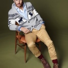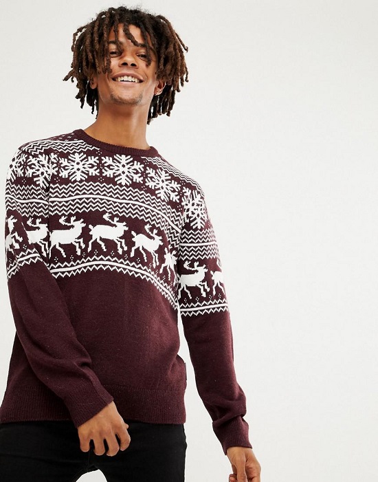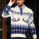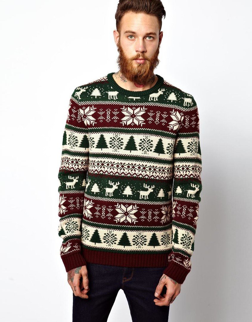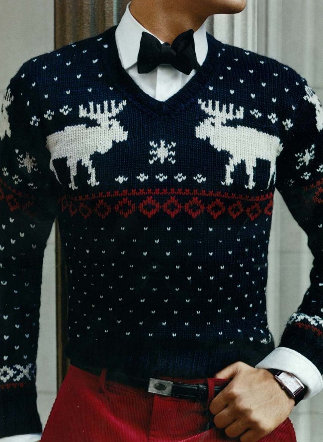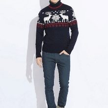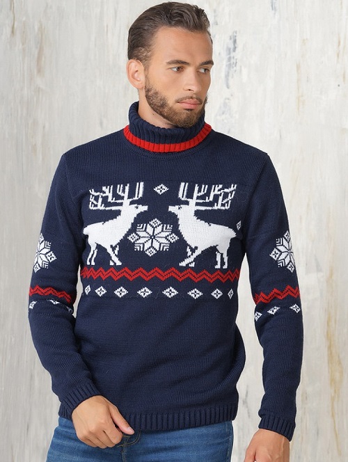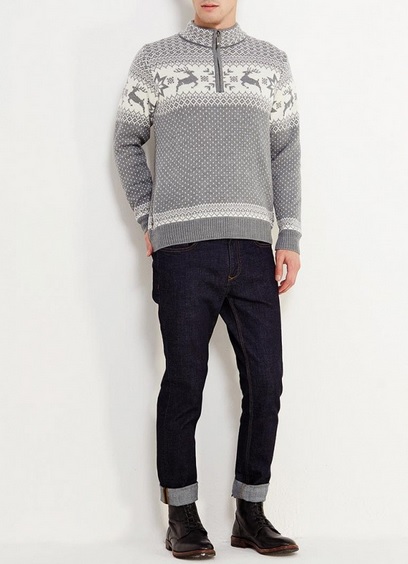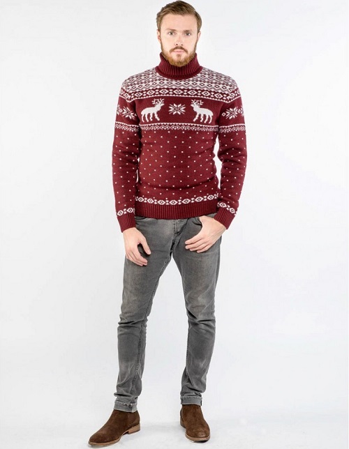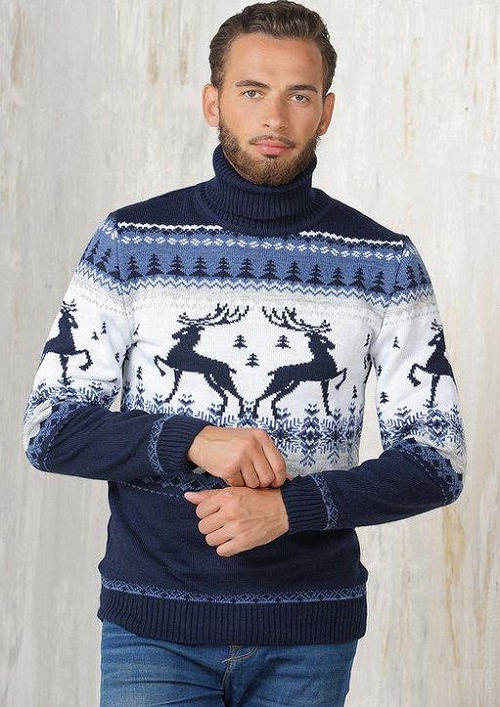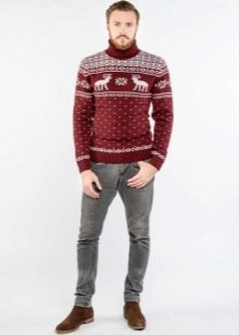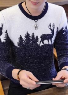 Malgré l'ornement accrocheur et les couleurs plutôt vives des produits, le pull pour homme avec cerf est une chose universelle. Il s'associera facilement avec un jean coupe classique de toutes les couleurs ou avec un pantalon en laine de couleur foncée. Il suffit de mettre une chemise dans une cage en dessous, d'ajouter des mocassins ou des moines à l'image pour correspondre à la ceinture.Une montre avec un grand cadran aura un aspect organique sur la main.