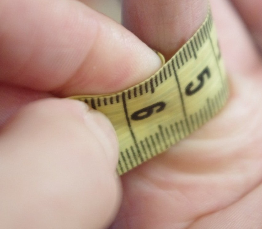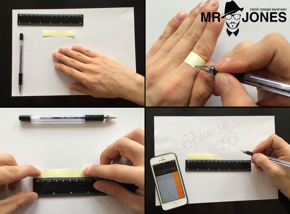 Vous devez d'abord préparer une feuille de papier en coupant un petit ruban dont la largeur ne dépassera pas une phalange de votre doigt. Enroulez votre doigt autour de la phalange avec le segment résultant. Faites une marque visible au niveau du joint et coupez l'excédent. Mesurez la longueur de la bande de papier. Dans ce cas, convertissez également le résultat en millimètres. Pour obtenir le nombre final (taille requise), il doit être divisé par 3,14.