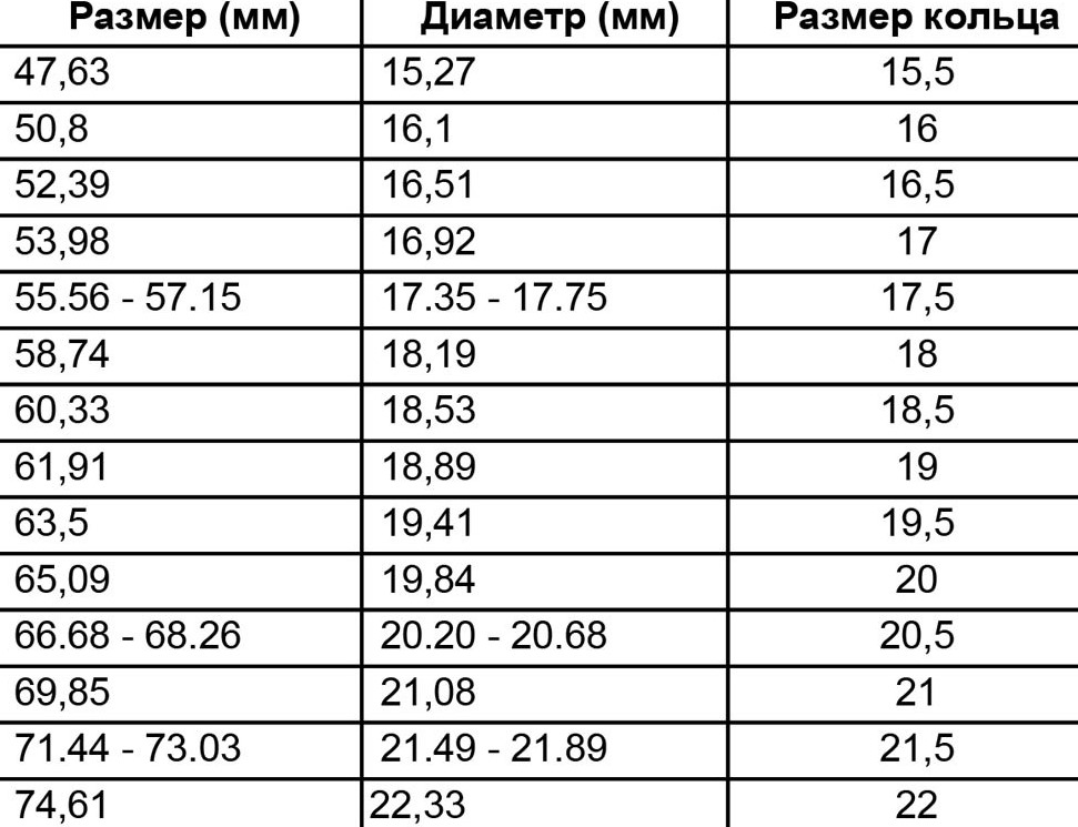 Remarque : sur l'immensité du réseau mondial, vous pouvez trouver de nombreux tableaux avec lesquels vous pouvez déterminer avec précision la taille de la bague. En utilisant la méthode de mesure avec un rabat ou un fil, il est recommandé de mesurer plusieurs fois, de noter le résultat obtenu et de le vérifier à l'aide d'autres méthodes.