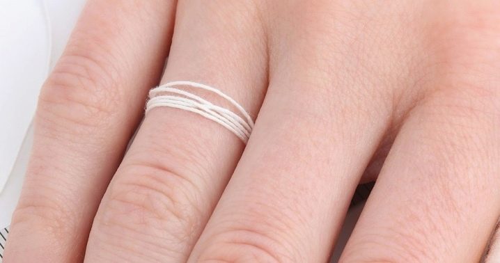Pour connaître la taille à la maison, l'habituel un fil... Aucun outil spécial n'est requis. Préparez aussi les ciseaux et règle. Vous devez d'abord prendre un morceau de fil et l'enrouler exactement 5 fois avec votre doigt. Appuyez fermement le fil contre la peau, mais n'appuyez pas trop fort, sinon le résultat sera inexact.