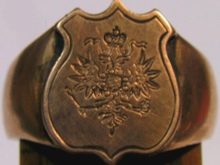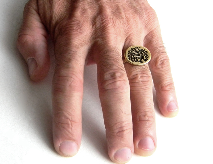 Une chevalière était une bague avec l'image des armoiries de la famille, la devise ou les initiales de son propriétaire. Des lettres importantes y étaient attachées en apposant une empreinte sur de la cire à cacheter ou de la cire fondue. Cela équivalait à une signature personnelle, garantissant l'authenticité du contenu de la lettre. De plus, le dessin sur la décoration a été découpé en réflexion inversée (miroir), de sorte que l'image correcte reste sur l'impression.