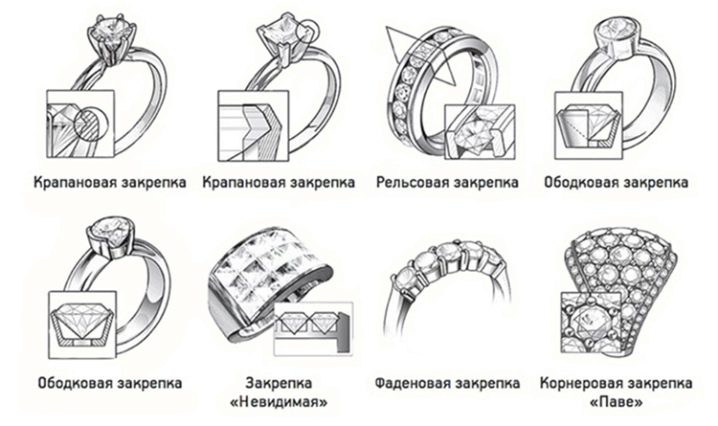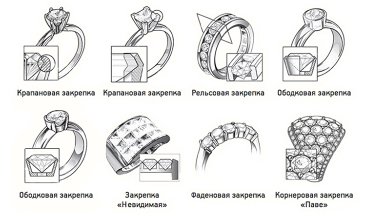 Selon les particularités de la fixation du diamant dans la bague, les experts distinguent les types de sertissage suivants :