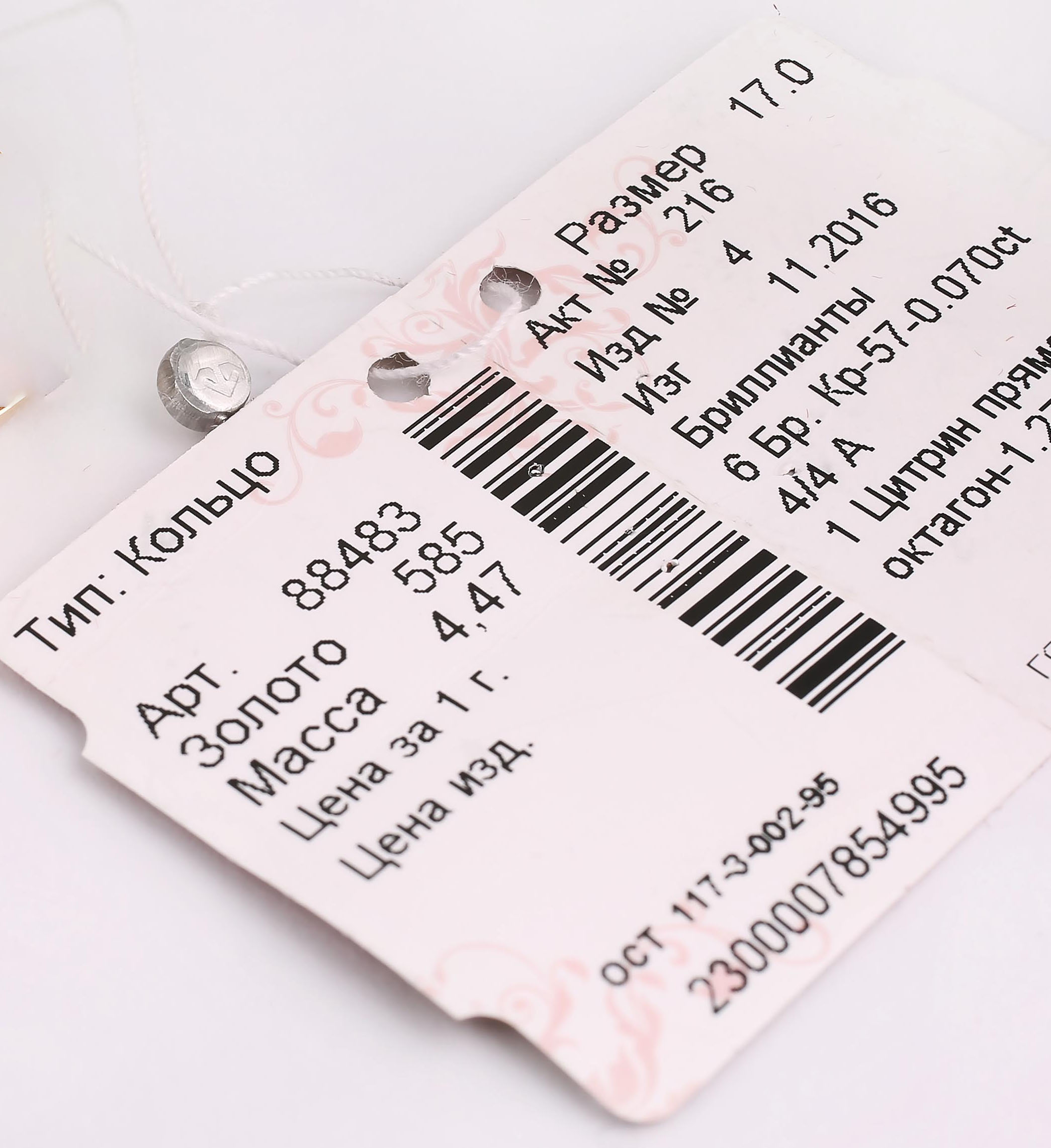 Une pièce avec un véritable diamant est accompagnée d'une étiquette spéciale, qui doit être remplie selon la norme en vigueur. Il doit indiquer le nom et l'article du produit, sa taille et son poids, ainsi que le type et l'échantillon du métal. Outre, l'étiquette doit contenir les informations suivantes sur la pierre elle-même : son nom (diamant) et ses caractéristiques - couleur, clarté, poids total, forme et qualité de coupe.