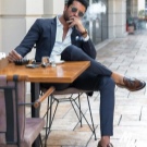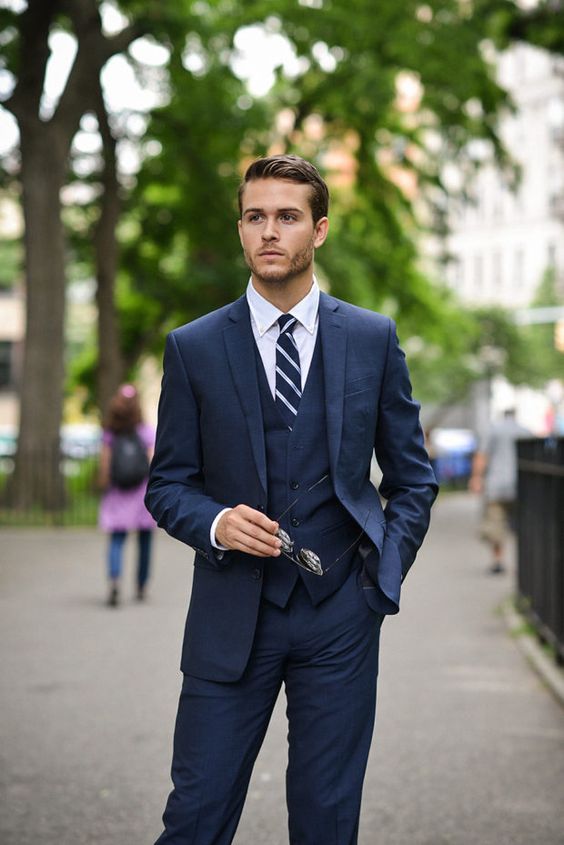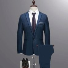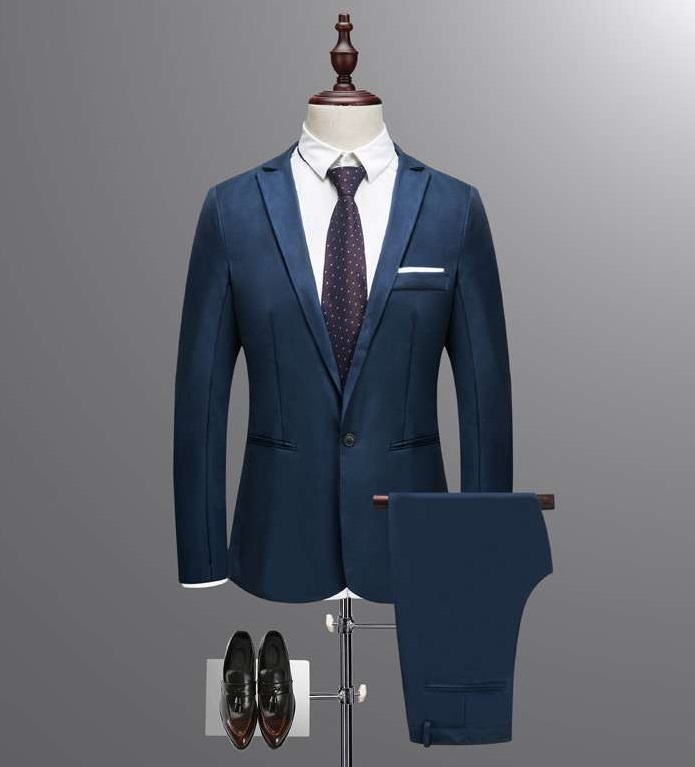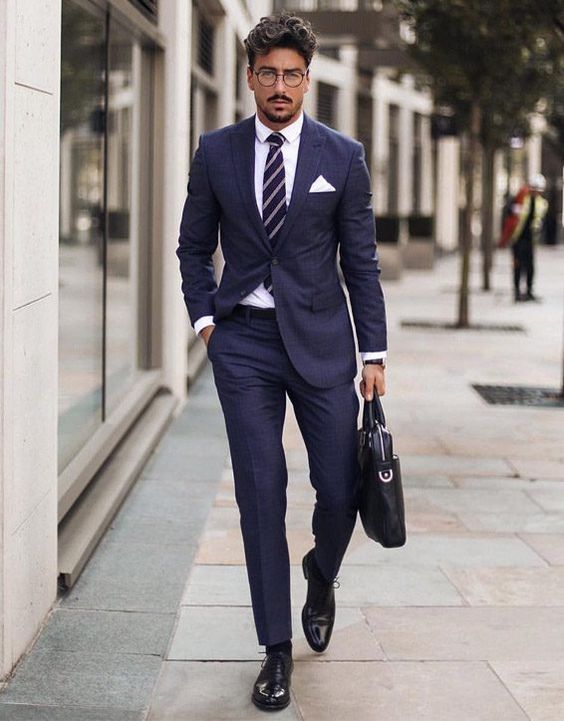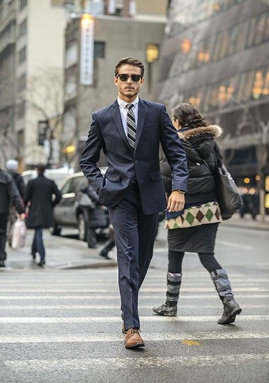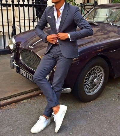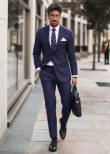 - Un costume bleu décontracté peut être dilué avec des baskets et un pull.