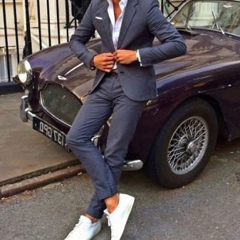 Et cela s'applique non seulement à la palette de couleurs des tissus et des imprimés, mais aussi à la qualité du matériau utilisé pour la couture. L'essentiel est qu'un homme se sente à l'aise dans une tenue décontractée, c'est très pratique pour lui de faire ses activités quotidiennes, de résoudre des moments de travail. Un représentant du sexe fort, vêtu d'un costume de style décontracté, se sent fort et libre.