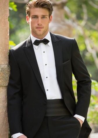 Le costume lui-même se distingue par la présence d'une poitrine ouverte et la présence de revers allongés. Certains modèles sont complétés par une ceinture. La veste peut être à double boutonnage, où le nombre de boutons ne dépasse pas trois pièces dans une rangée verticale. Une chemise blanche et un nœud papillon conviennent comme accessoires supplémentaires pour un smoking, ce qui est très impressionnant sur les hommes de grande taille.