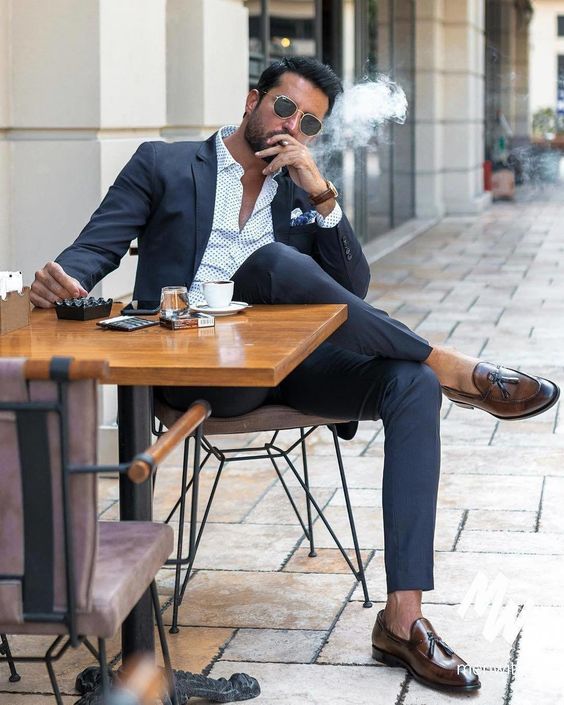- En outre, un costume noir est associé à un polo et l'image se termine par des mocassins ou des mocassins.