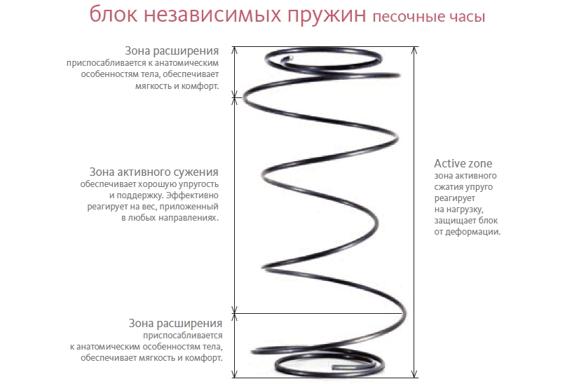 - "Sablier". Ce type de ressorts a été développé par la société "Ascona", notamment pour des charges accrues. Le diamètre des éléments atteint ici 60 mm, la capacité portante de chacun est portée à 3,5 kg, le nombre de tours est de 7,5.