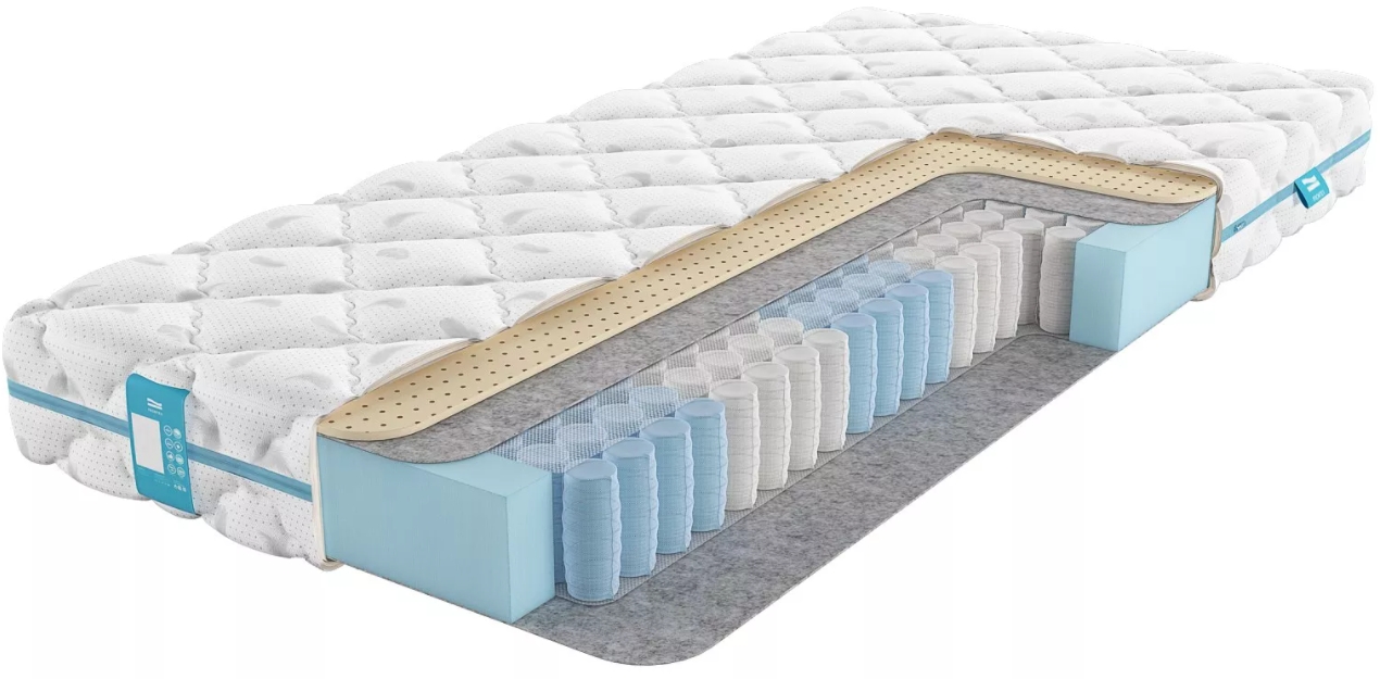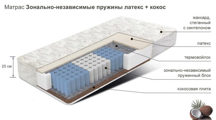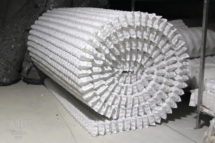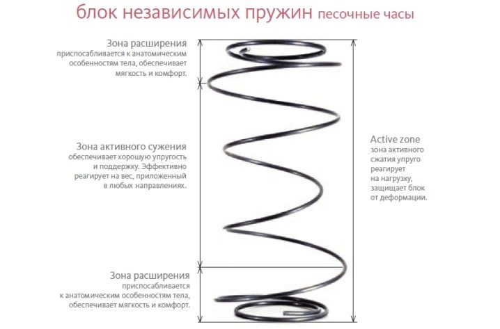 Les matelas modernes avec un bloc à ressorts ont un type de conception indépendant. Chaque élément de support en eux est placé dans un couvercle spécial qui l'isole des autres. Cela élimine l'effet hamac et garantit une répartition uniforme de la charge. Les ressorts sont en acier trempé, leur diamètre varie de 20 à 60 mm avec jusqu'à 8 tours. La forme de chaque élément est en forme de tonneau ou en forme de sablier.