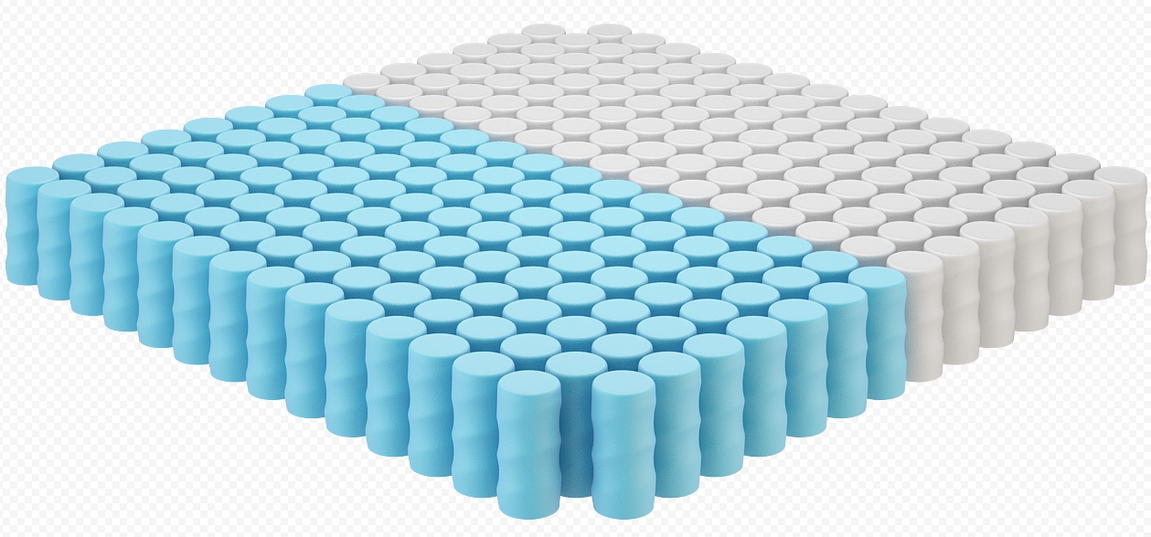- Avec un double bloc. Également connu sous le nom de DualSpring. Le bloc se compose d'éléments du type "ressort dans un ressort", bien adaptés aux personnes endormies avec une grande différence de poids corporel. La partie extérieure a 256 éléments, la partie intérieure - 128. L'élément caché fonctionne bien sous de lourdes charges.