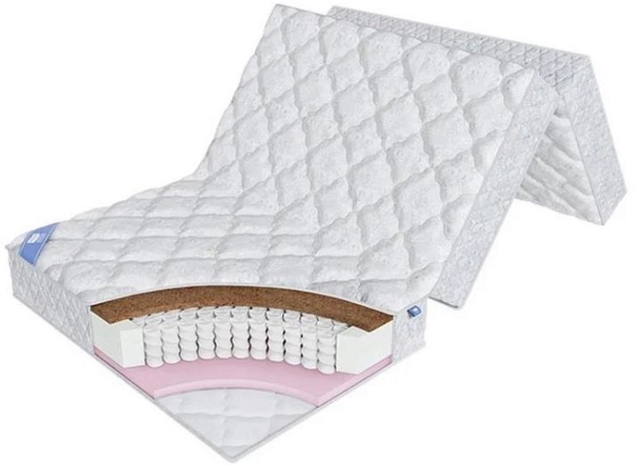 Contrairement aux modèles discutés ci-dessus, ce matelas a une conception à ressorts. Il est représenté par des éléments indépendants dont la densité est de 256 unités pour 1 m². m. Le premier côté du produit est relativement dur, ce qui s'explique par la fibre de coco qui le forme, et le second est en latex synthétique et se distingue par une douceur prononcée. Les deux charges interagissent organiquement avec le bloc à ressort, qui suit clairement les contours de la figure.